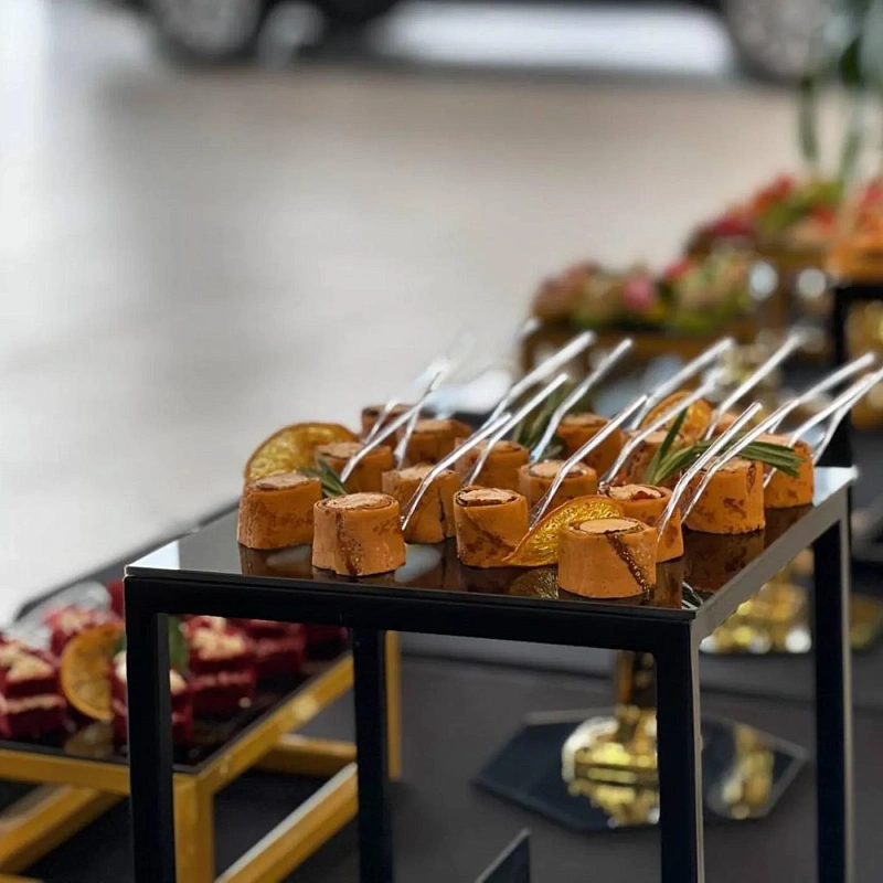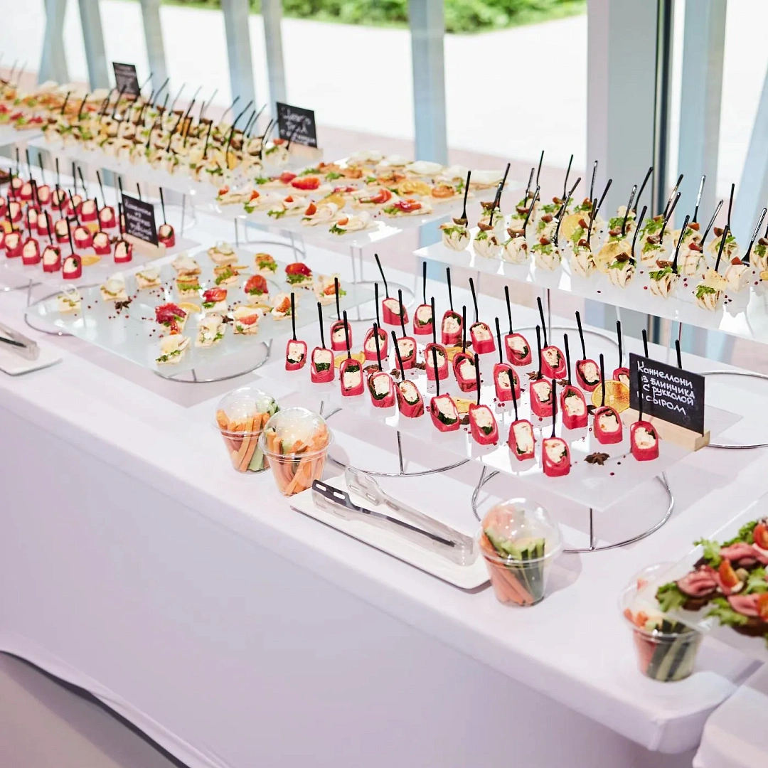 Главный вопрос при подготовке — сколько еды нужно. В среднем на одного гостя приходится 6–8 видов закусок и около 12–15 порций в мини-формате. Для 30 человек это примерно 360–450 закусок в совокупности. Дополнительно стоит предусмотреть сладкий стол и напитки. Баланс меню важен: мясные и рыбные закуски должны сочетаться с овощными и фруктовыми позициями, а десерты завершат общее впечатление.