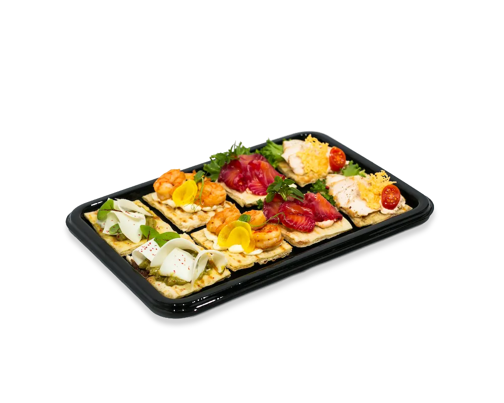 Брускетты с тигровой креветкой, маринованным лососем, цыпленком и соусом Цезарь, козьим сыром и муссом из авокадо