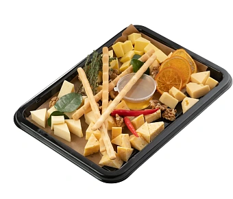 Из сыров: полутвердый, мраморный, тильзитер. С добавлением меда, ореха грецкого и соломка Гриссини