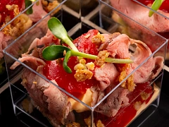 Новогодние закуски могут быть очень сытными, они даже способны заменить собой горячие блюда. Это особенно актуально, если вы запланировали небольшую вечеринку в офисе или новогодний фуршет, где горячие блюда не предусмотрены, но хочется, чтобы гости были сытыми. В таком случае мы рекомендуем заказать говядину в сливочном соусе с грибами, запеченную в касалетке под слойкой. Это невероятно аппетитное мясное блюдо, которое точно никого не оставит на празднике голодным. Также вы можете подать гостям праздничный киш — мини-пирог с потрясающей лососевой начинкой.