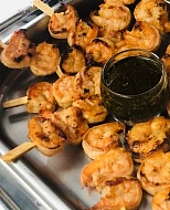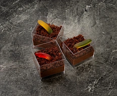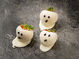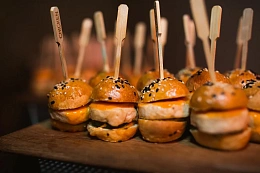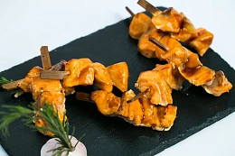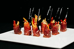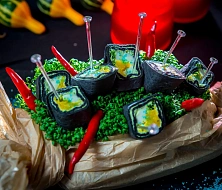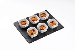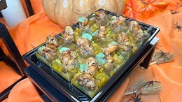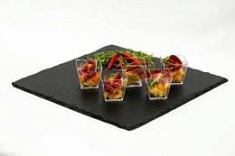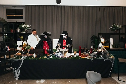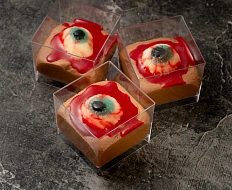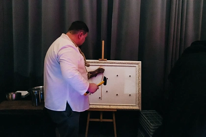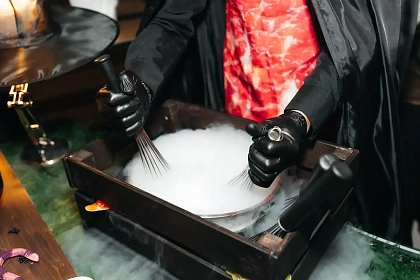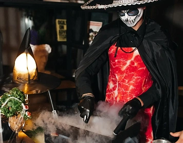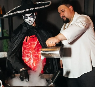 Авторская станция “Кровавый Тар-Тар” с говяжьей вырезкой. Повар отрезает мелкие кубики мяса от говяжьей вырезки, прибитой на мольберт, с которого капают капли крови. Далее готовится сорбет из печеного острого томата. Подается мясная закуска в порционной мартинке, приправленная специями и соусами по вкусу гостя.