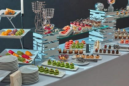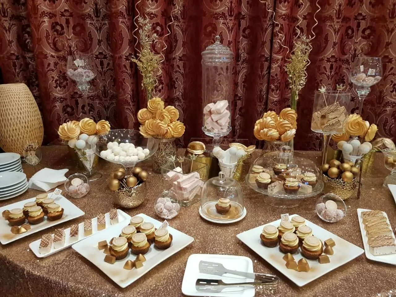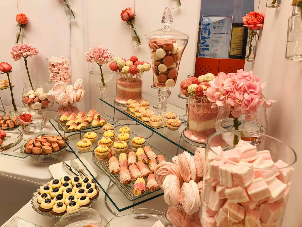 Кэнди бар с авторскими десертами и конфетами ручной работы. Гостям будет предложен сладкий фуршетный стол, который сервируется различными десертами: капкейки, пирожные, макаруны, птифуры, зефир и другие угощения.