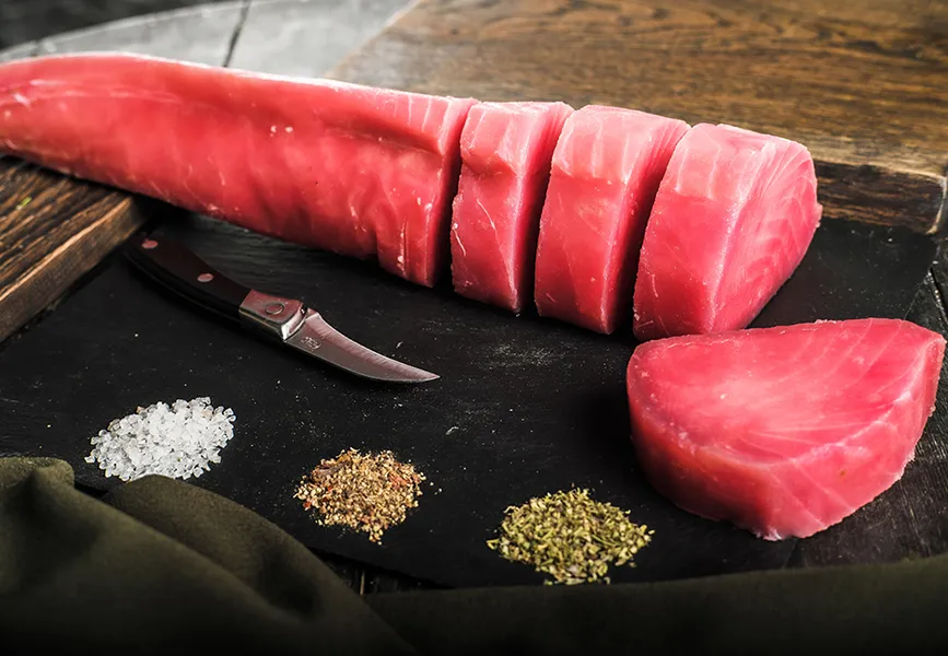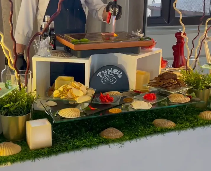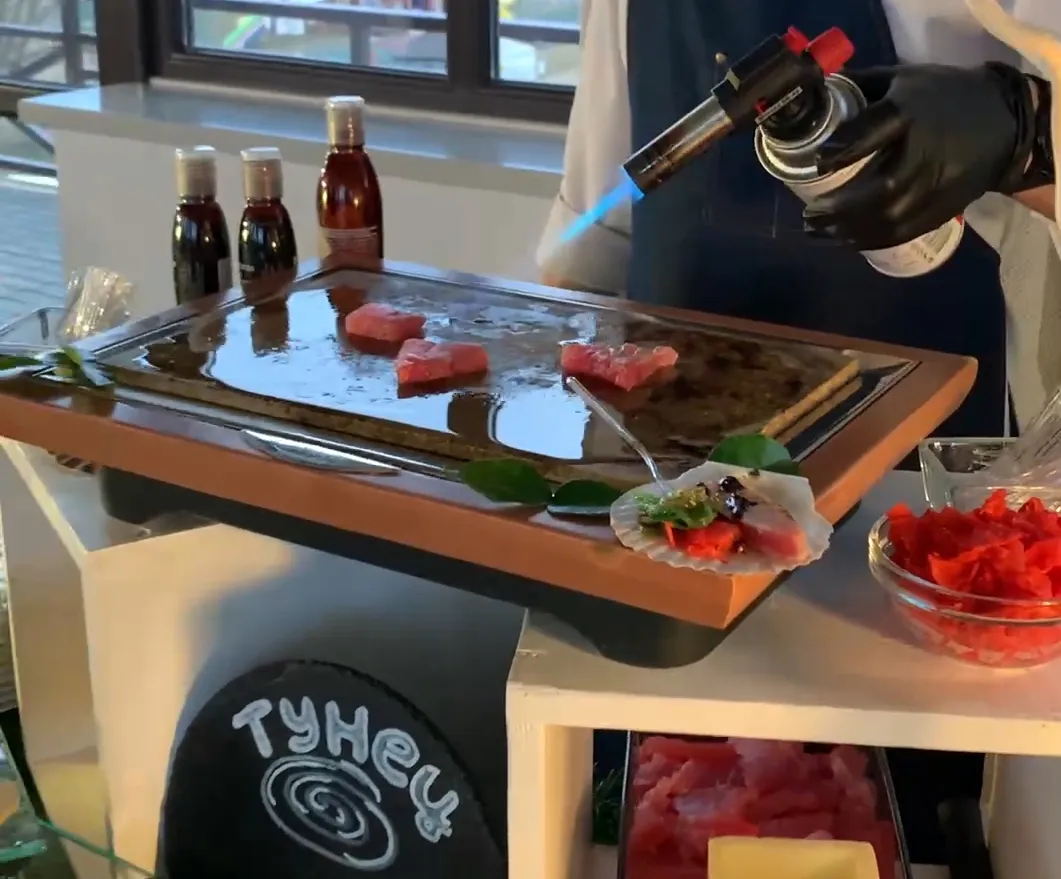 Станция с демонстрационным приготовлением тунца на вулканическом камне.