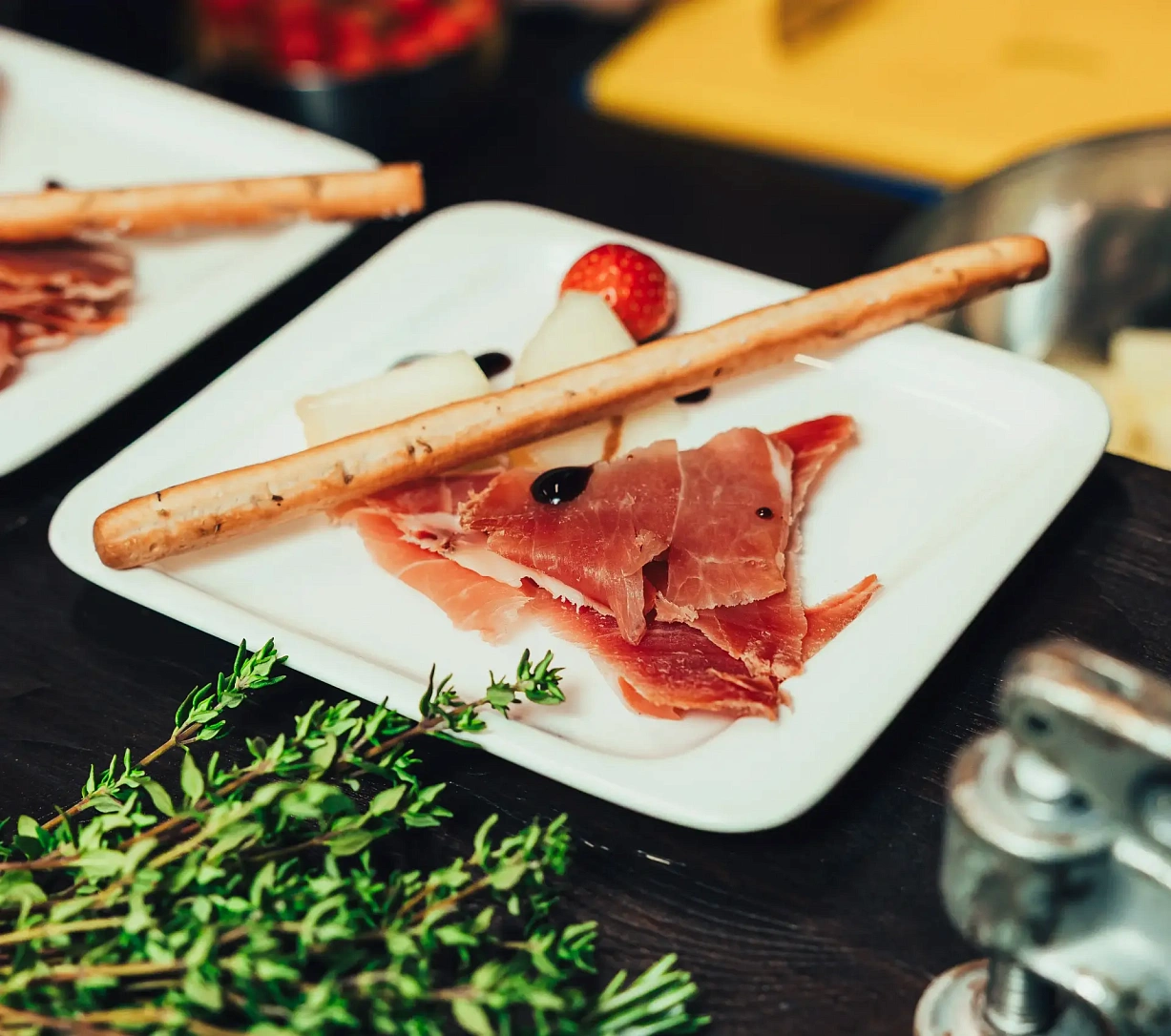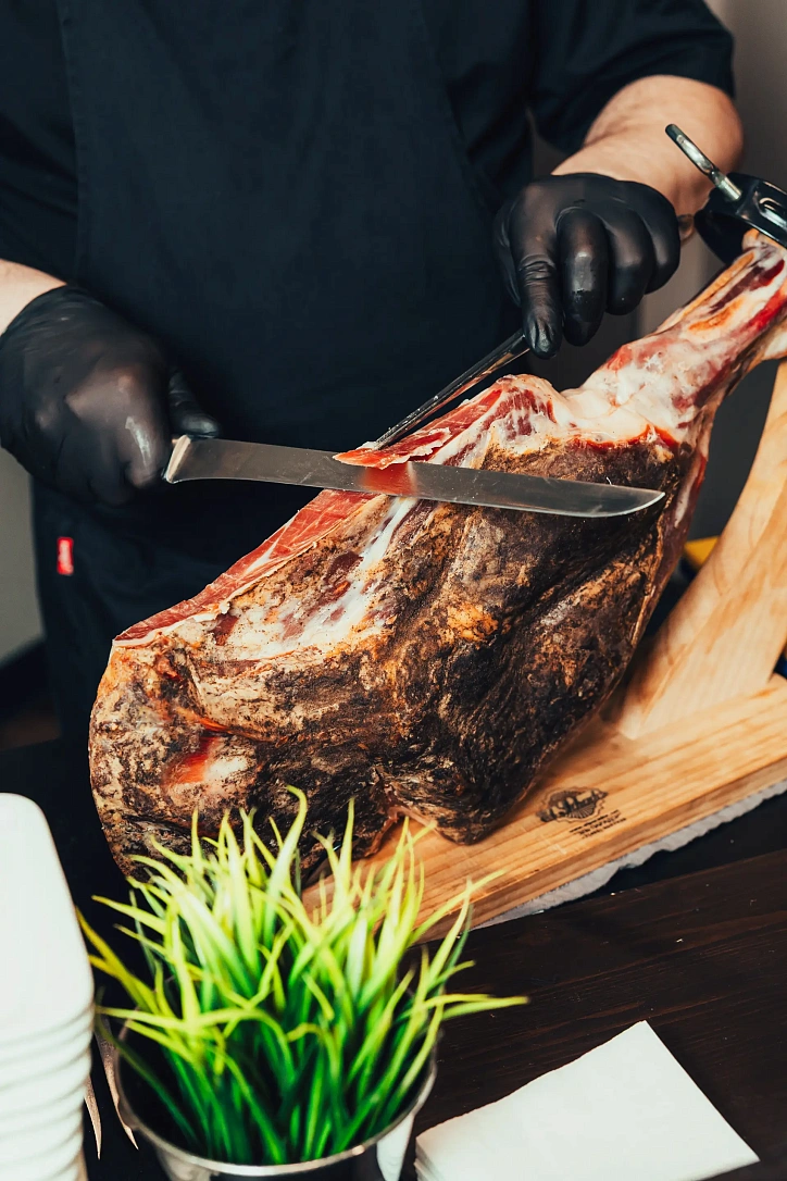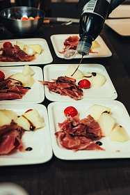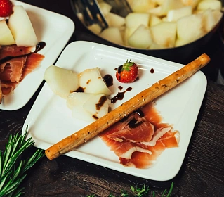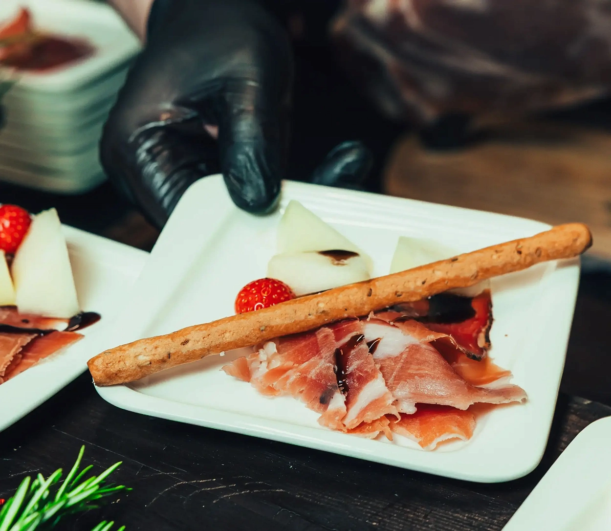 Тонкая нарезка хамона с дыней, свежей зеленью и бальзамическим ягодным соусом — элегантная подача для мероприятий высокого уровня.