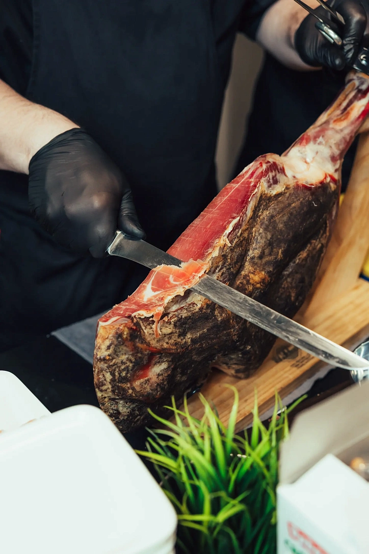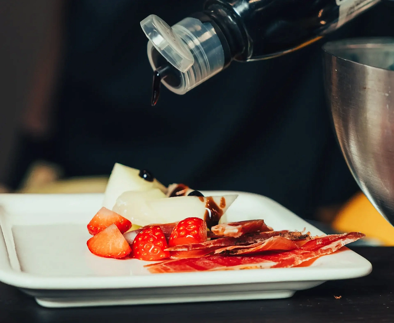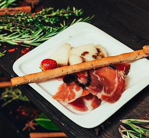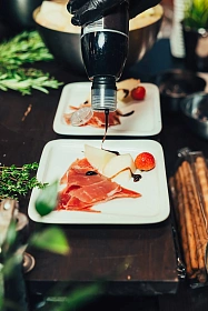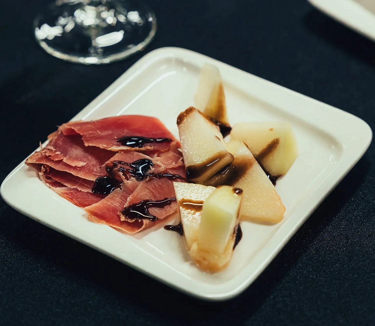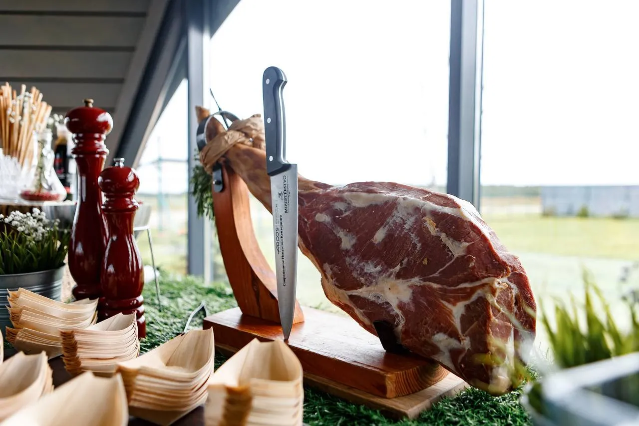 Тонкая нарезка хамона с дыней, свежей зеленью и бальзамическим ягодным соусом — элегантная подача для мероприятий высокого уровня.