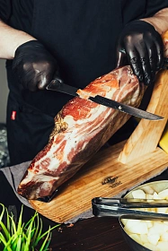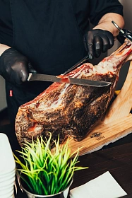 Ломтики фламбированного ягненка на карамелизованном инжире с соусом Блюбери