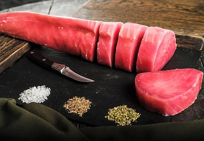 Повар при гостях приготовит ломтики красного тунца на вулканическом камне, с элементами фламбирования. Подается с приправами из пряных трав на маринованном огурце под авторским соусом.