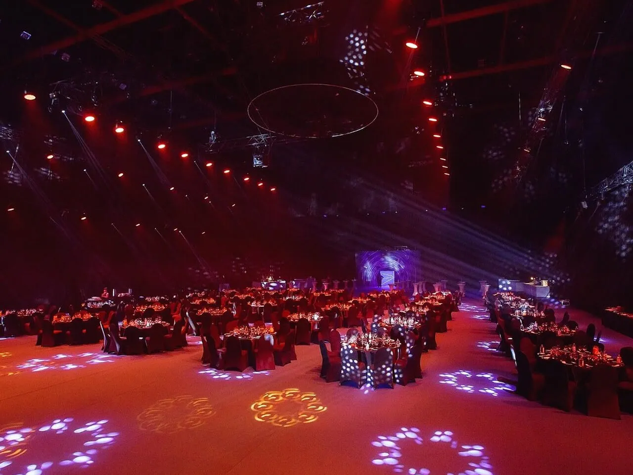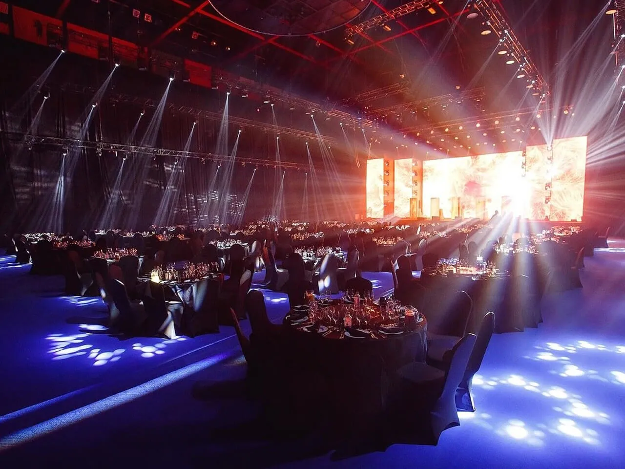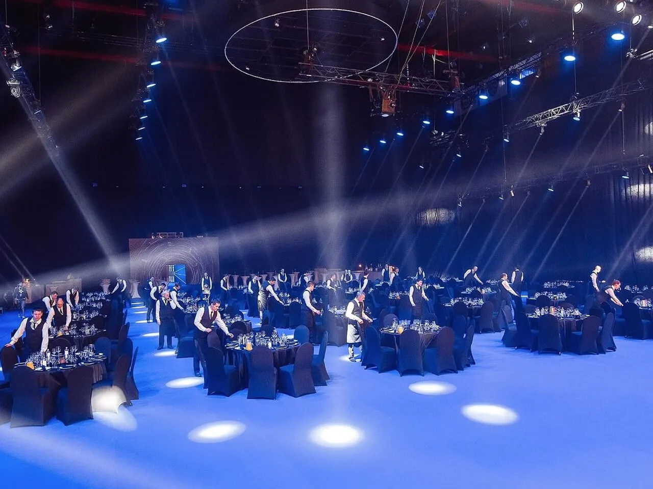 Для участников конференции были проведены кофе-брейк, обед и банкет в невероятном по своим размерам ангаре с потрясающими световыми инсталляциями и оформлением.