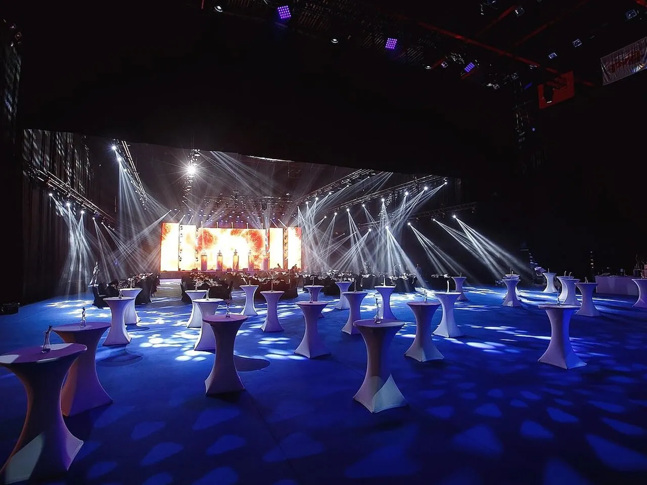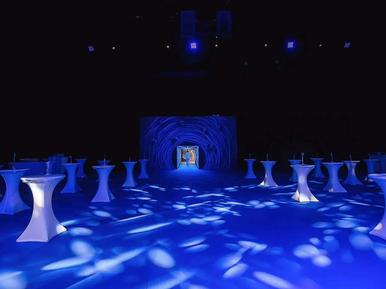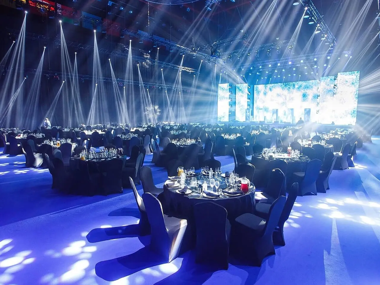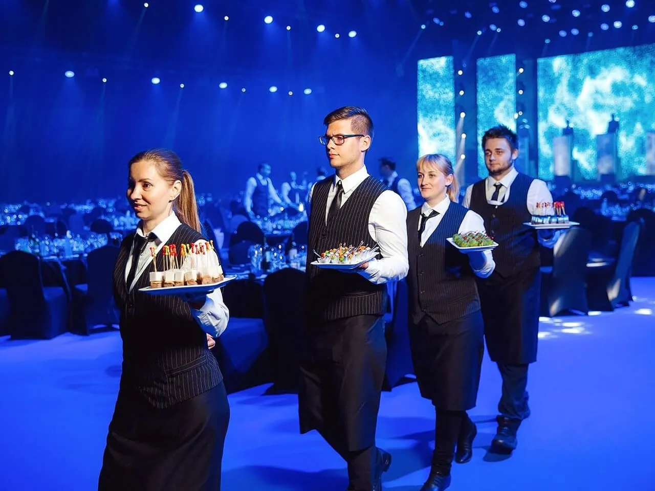Для участников конференции были проведены кофе-брейк, обед и банкет в невероятном по своим размерам ангаре с потрясающими световыми инсталляциями и оформлением.