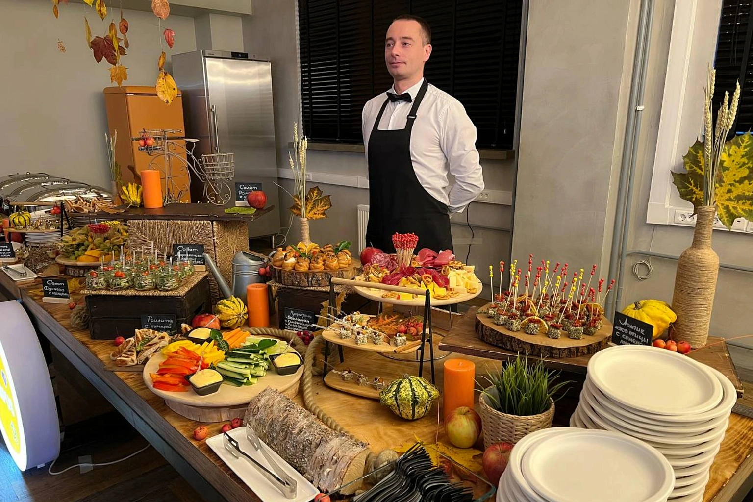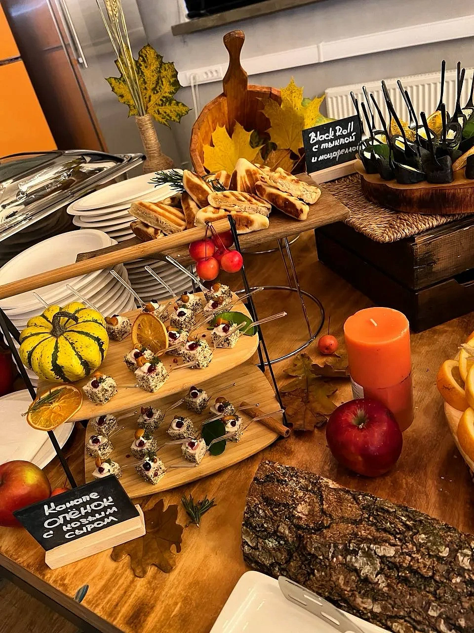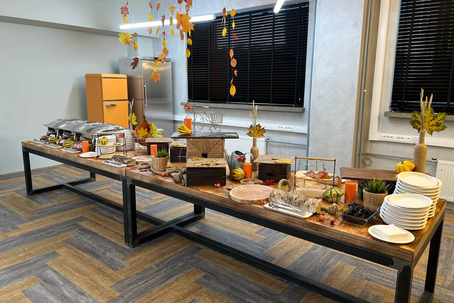 Оформляли фуршетный стол и бар для презентации нового продукта для сотрудников Киви банка, тематика - университетский кампус, акценты на теплый осенний декор - тыквы, яблоки, листья.