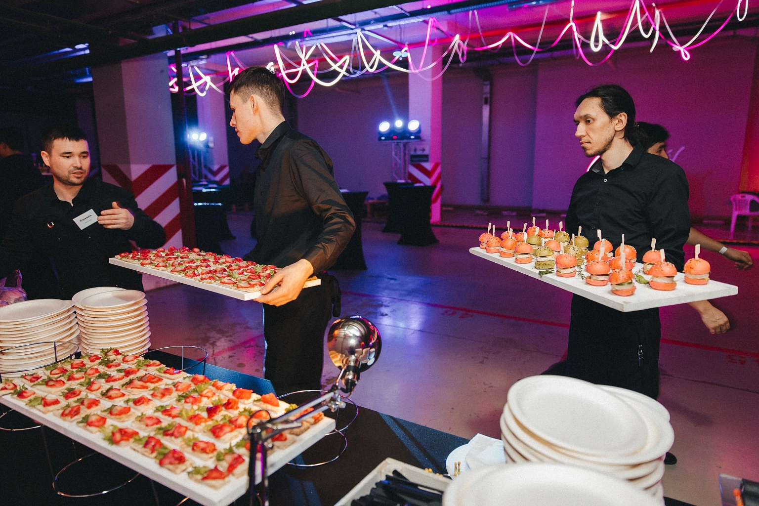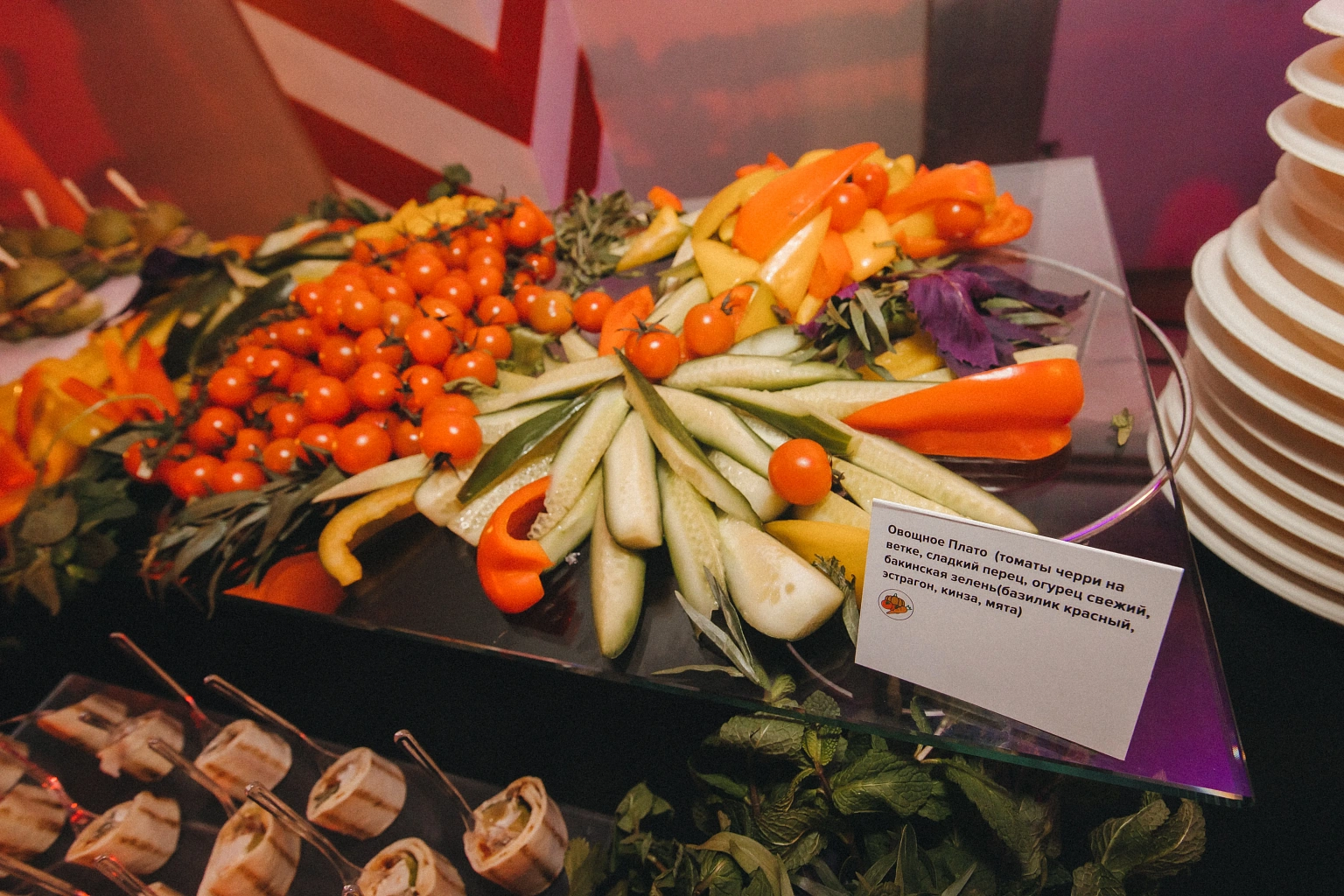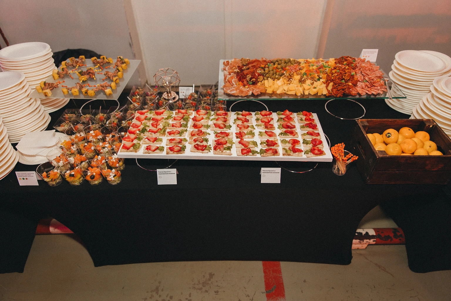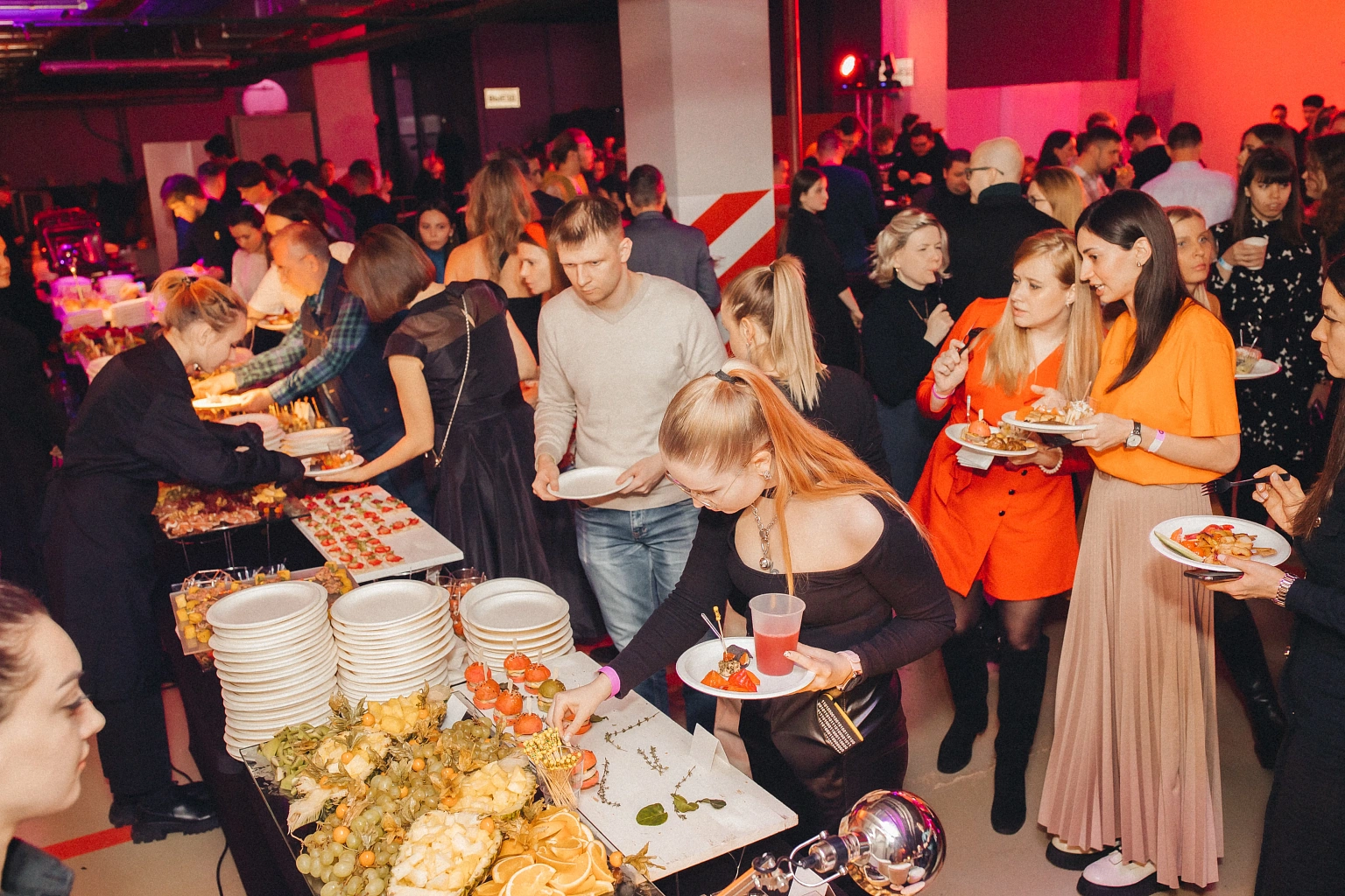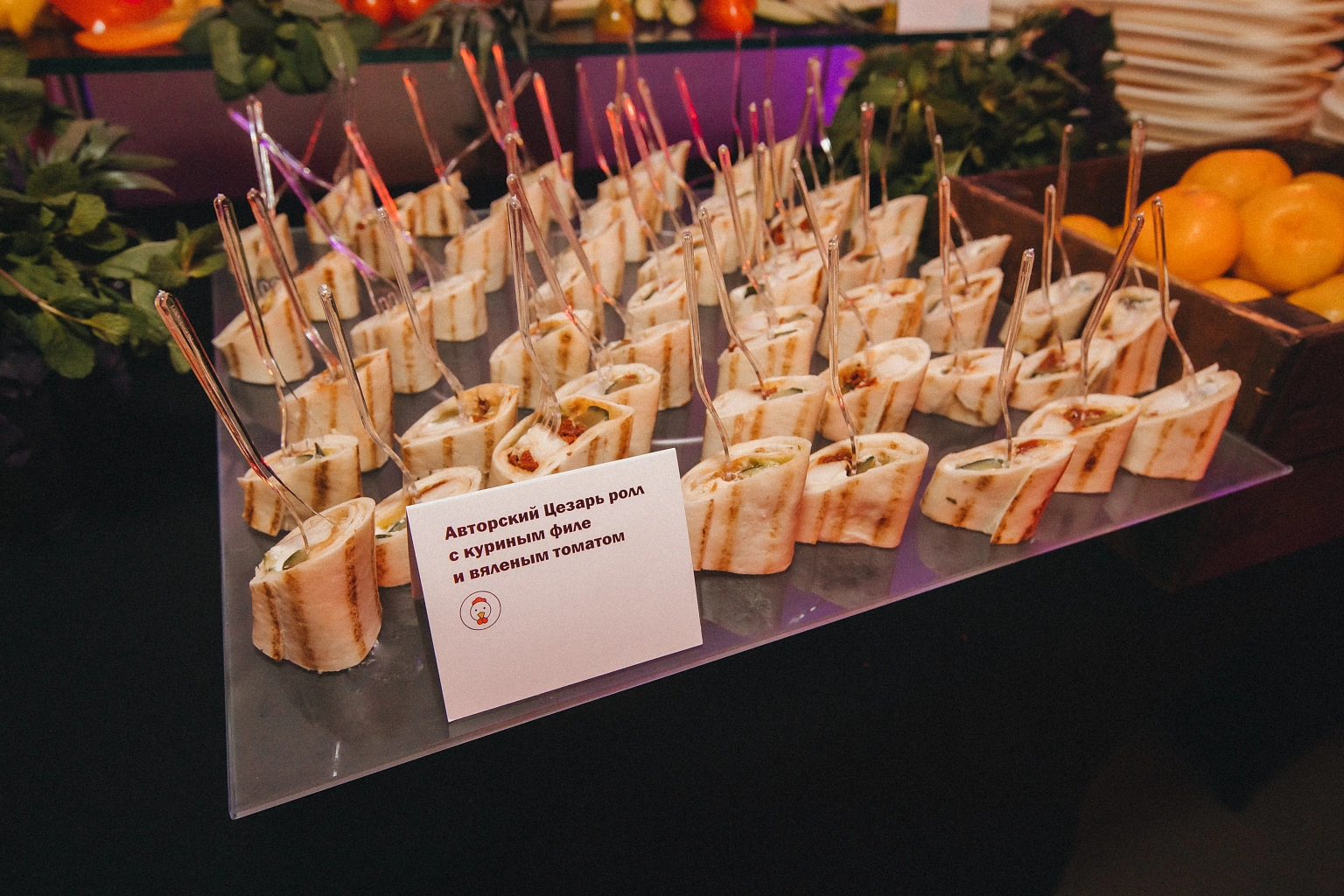 Масштабное мероприятие для гостей которого приготовили множество различных закусок холодных и горячих с красивой подачей.