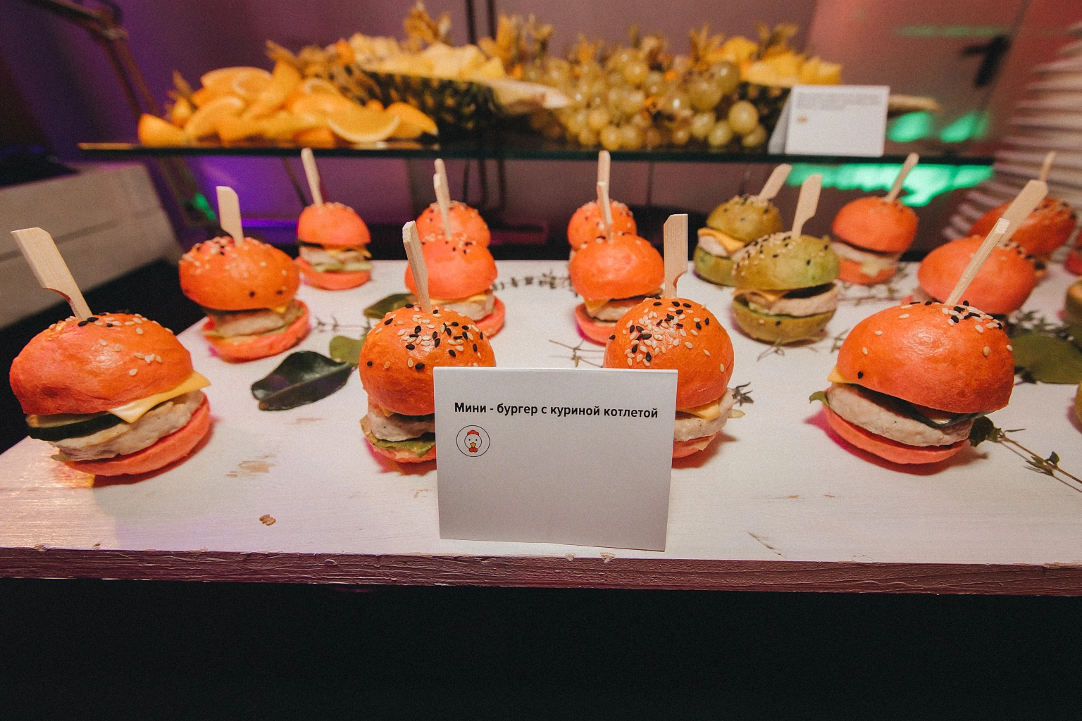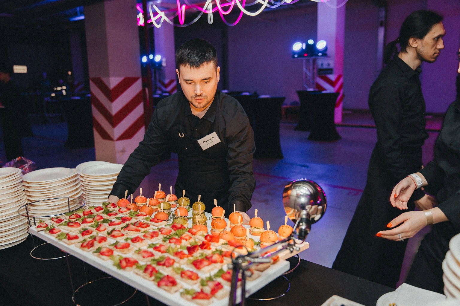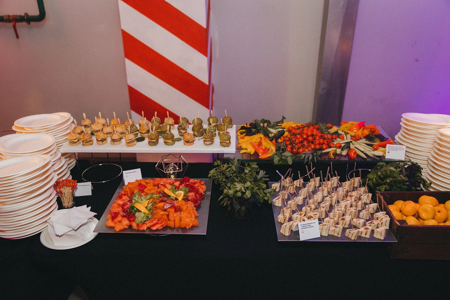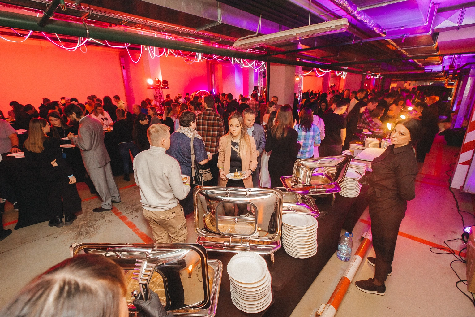 Масштабное мероприятие для гостей которого приготовили множество различных закусок холодных и горячих с красивой подачей.