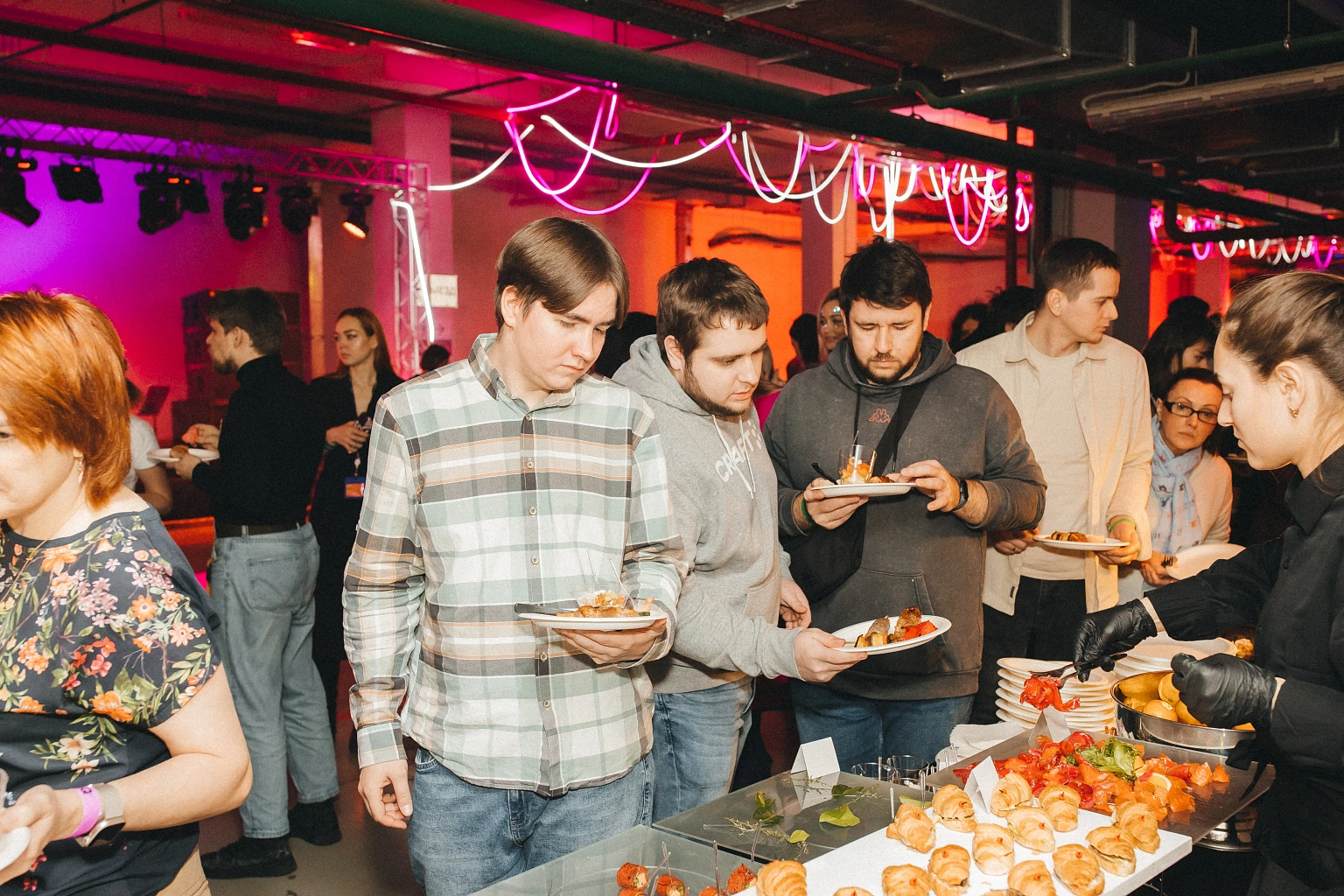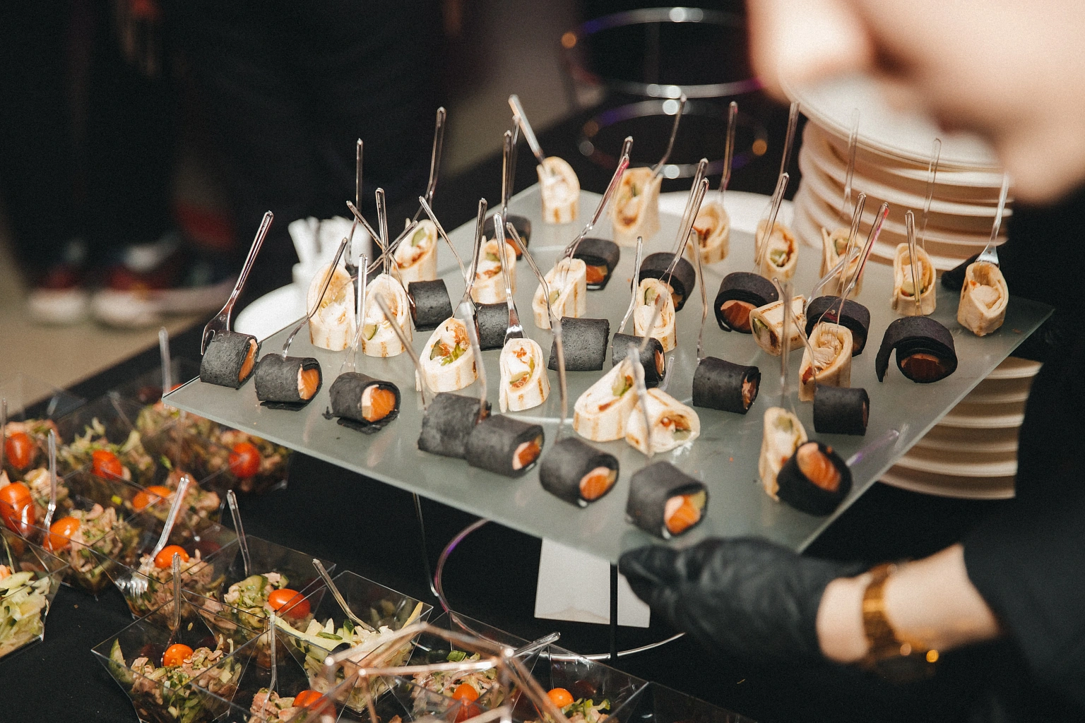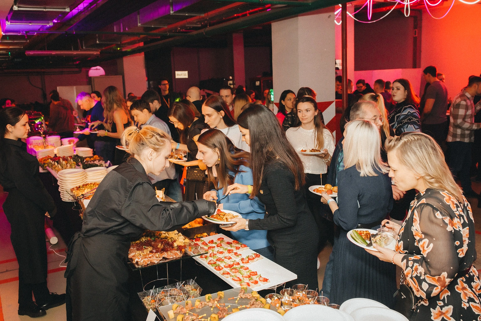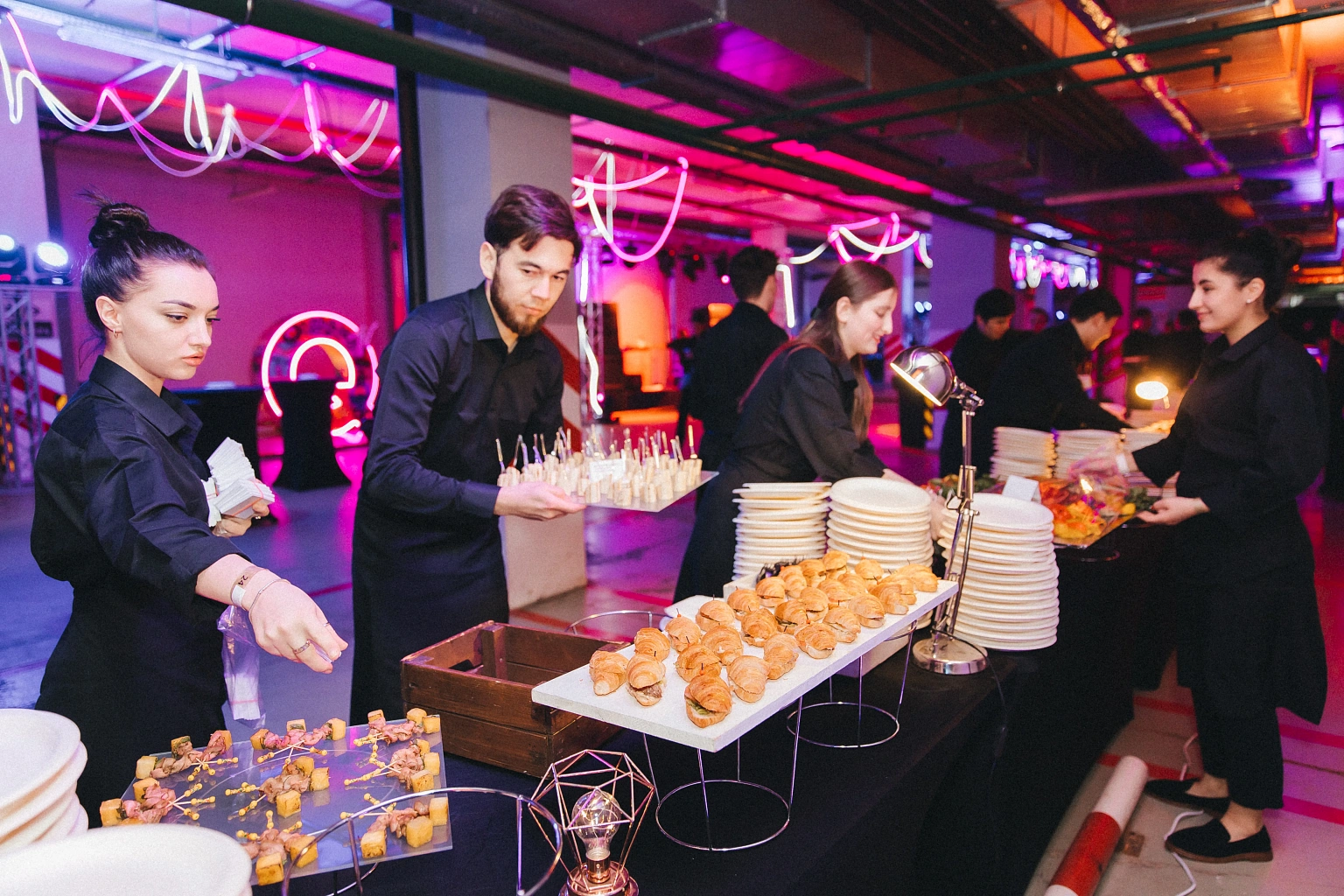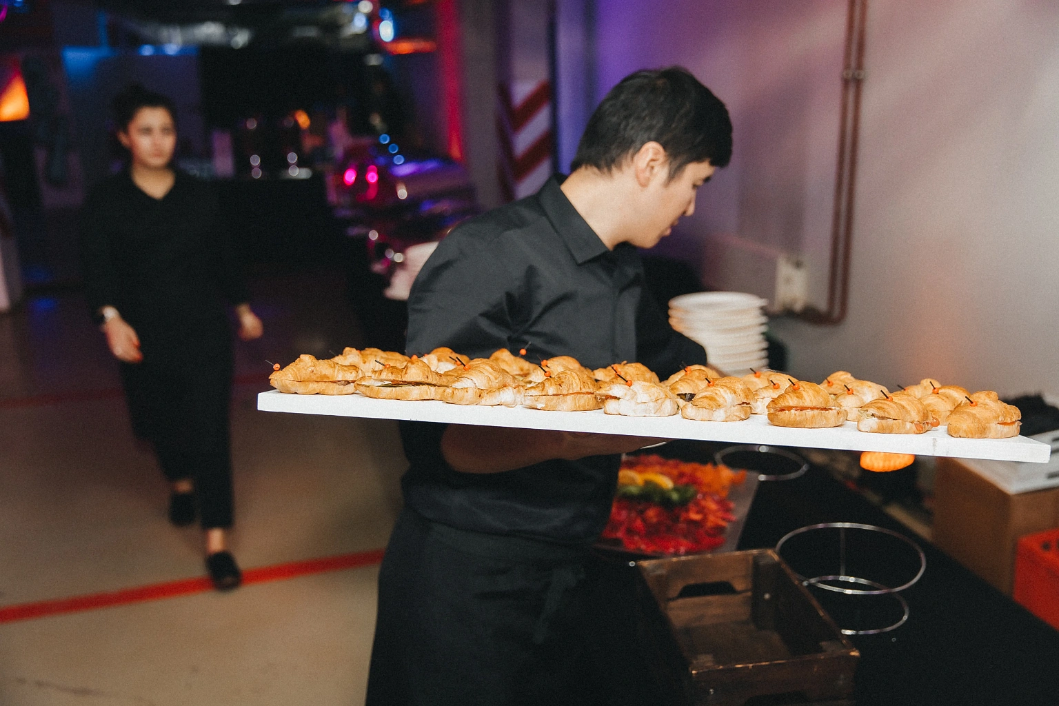 Масштабное мероприятие для гостей которого приготовили множество различных закусок холодных и горячих с красивой подачей.