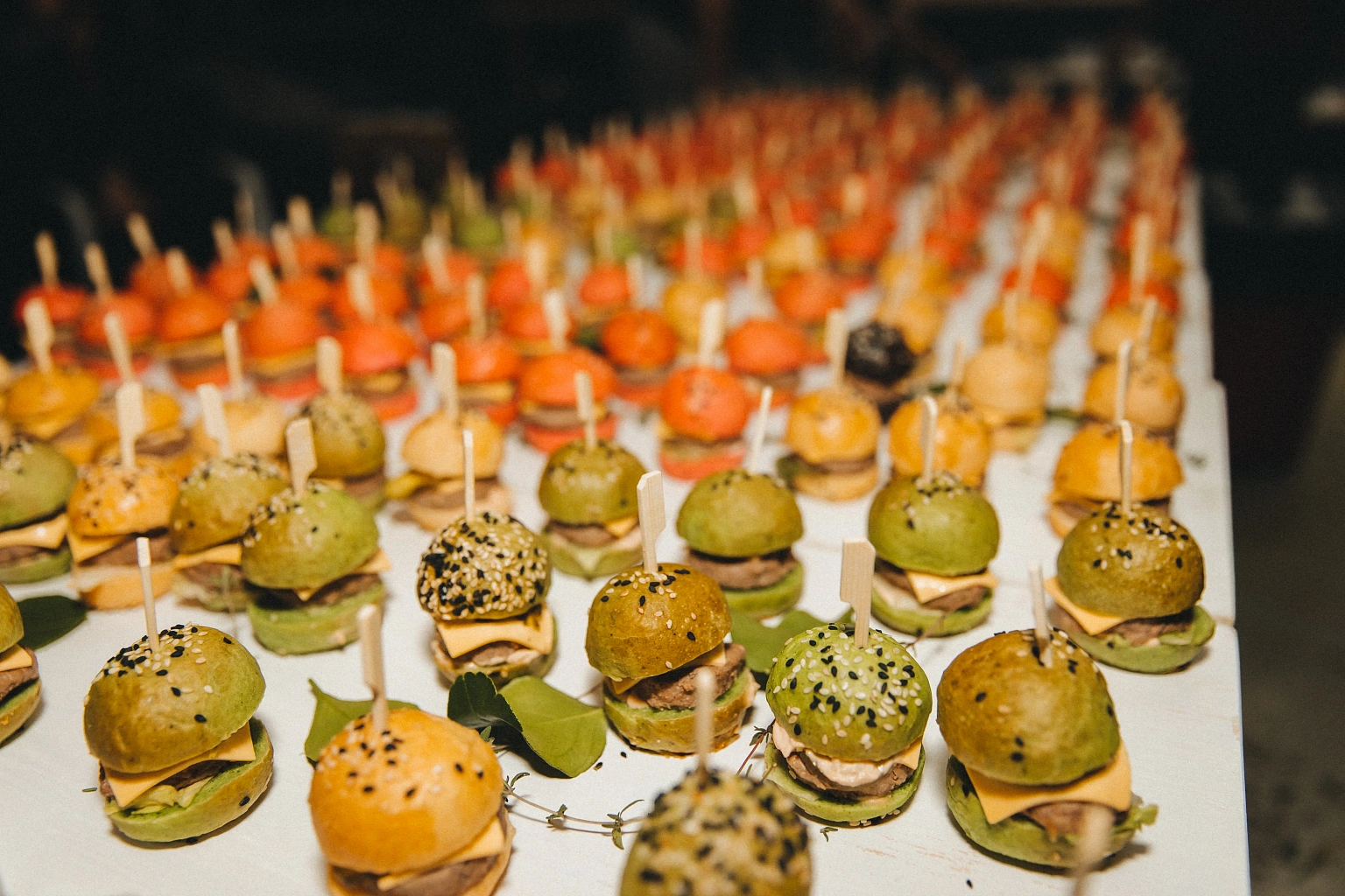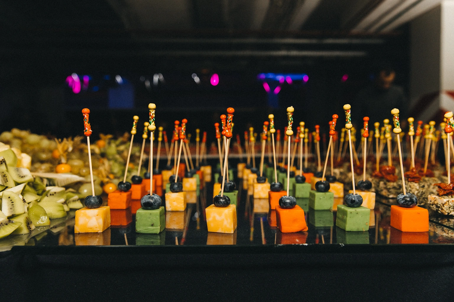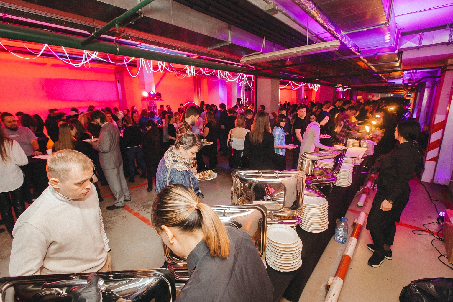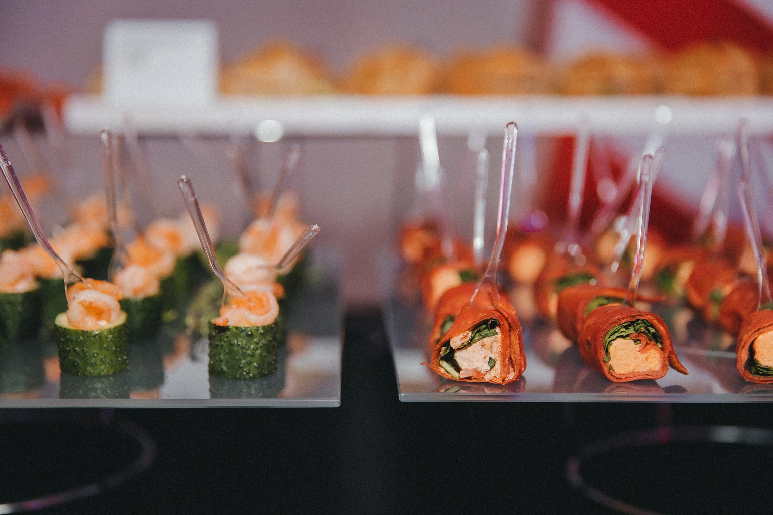Масштабное мероприятие для гостей которого приготовили множество различных закусок холодных и горячих с красивой подачей.