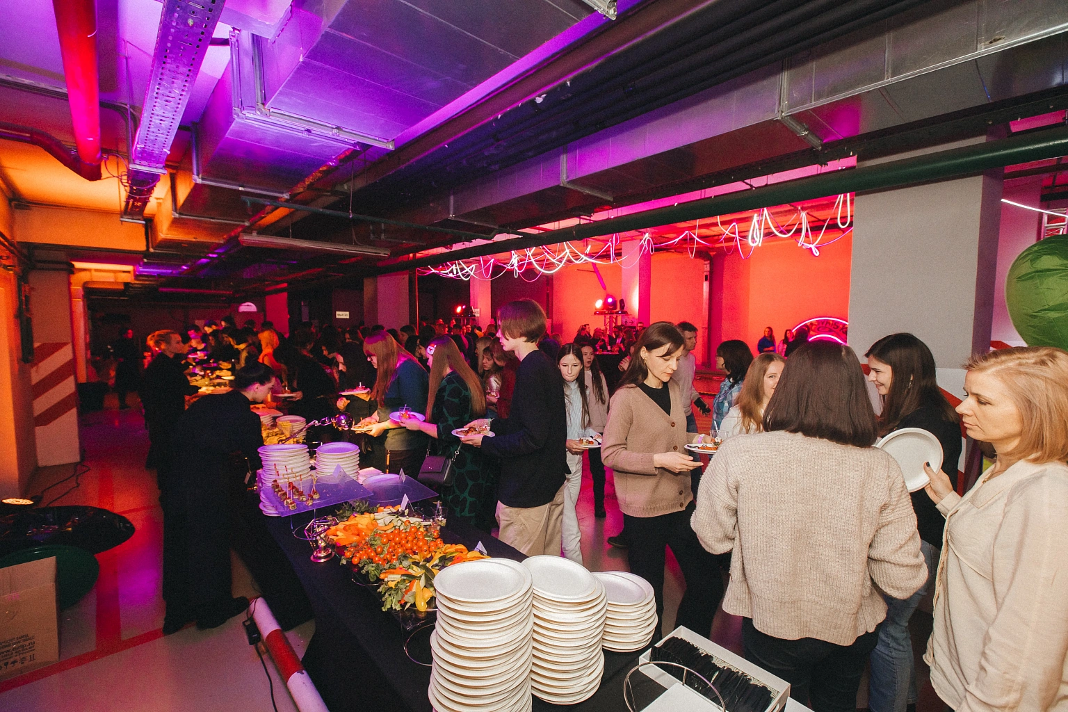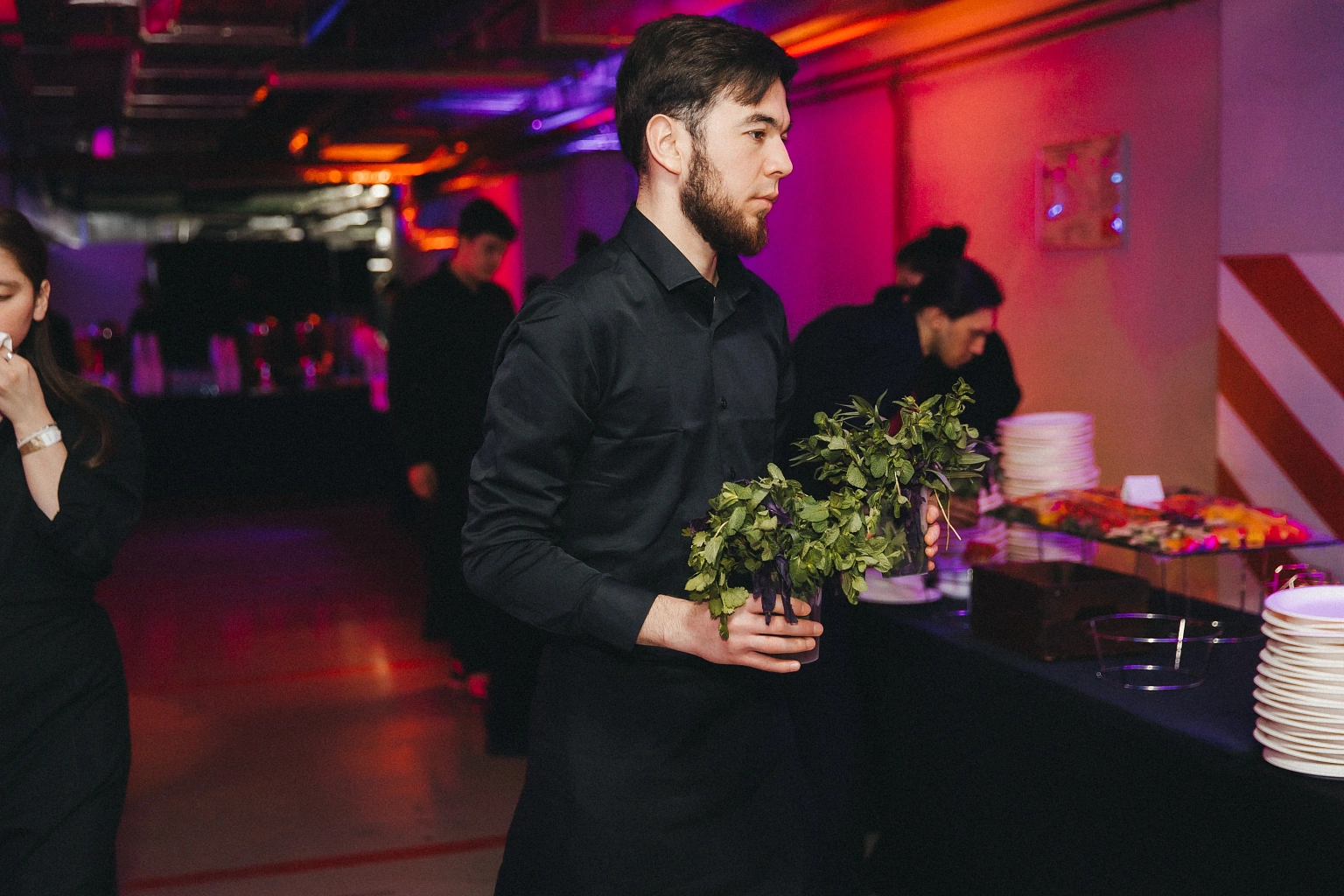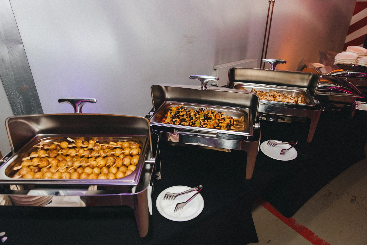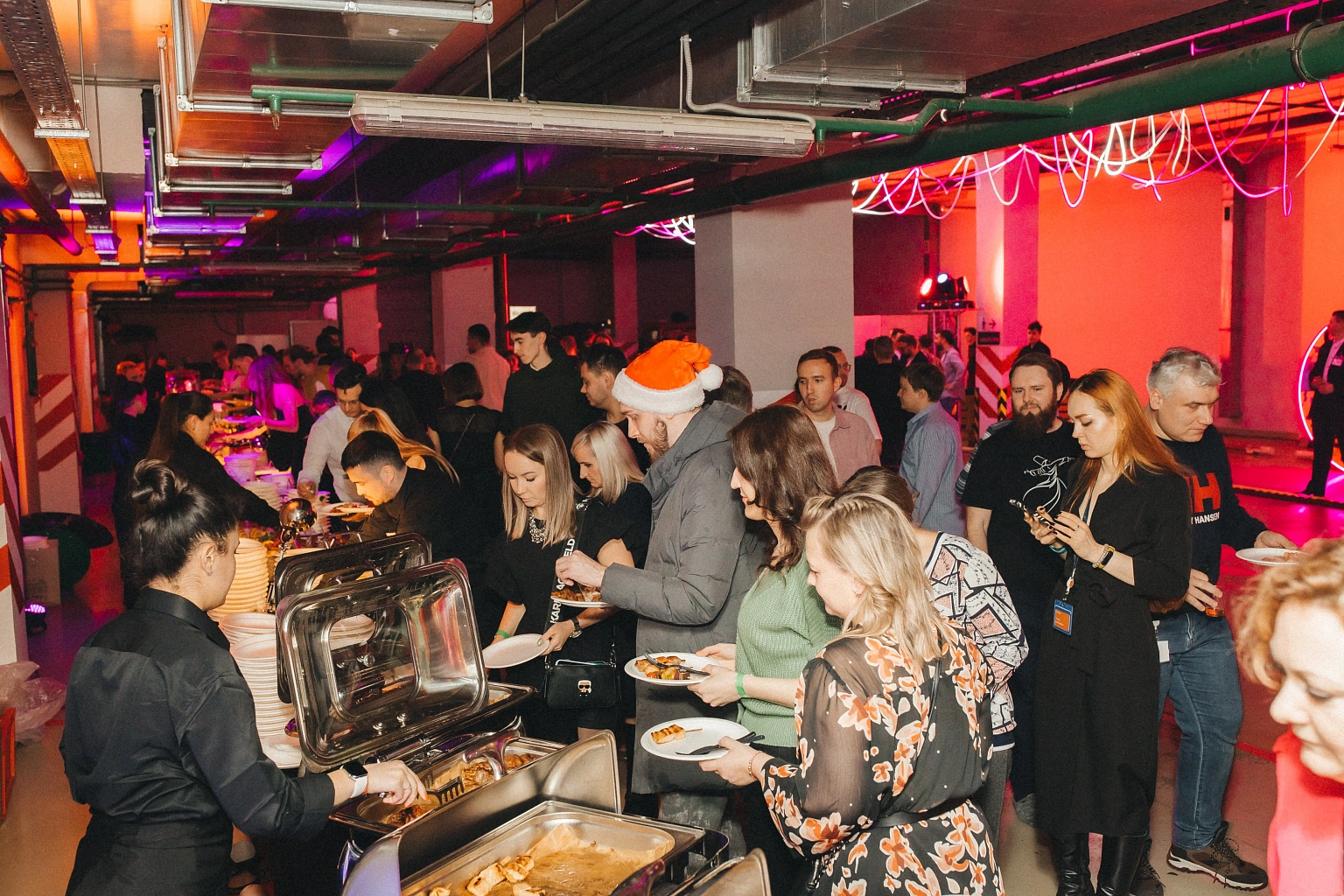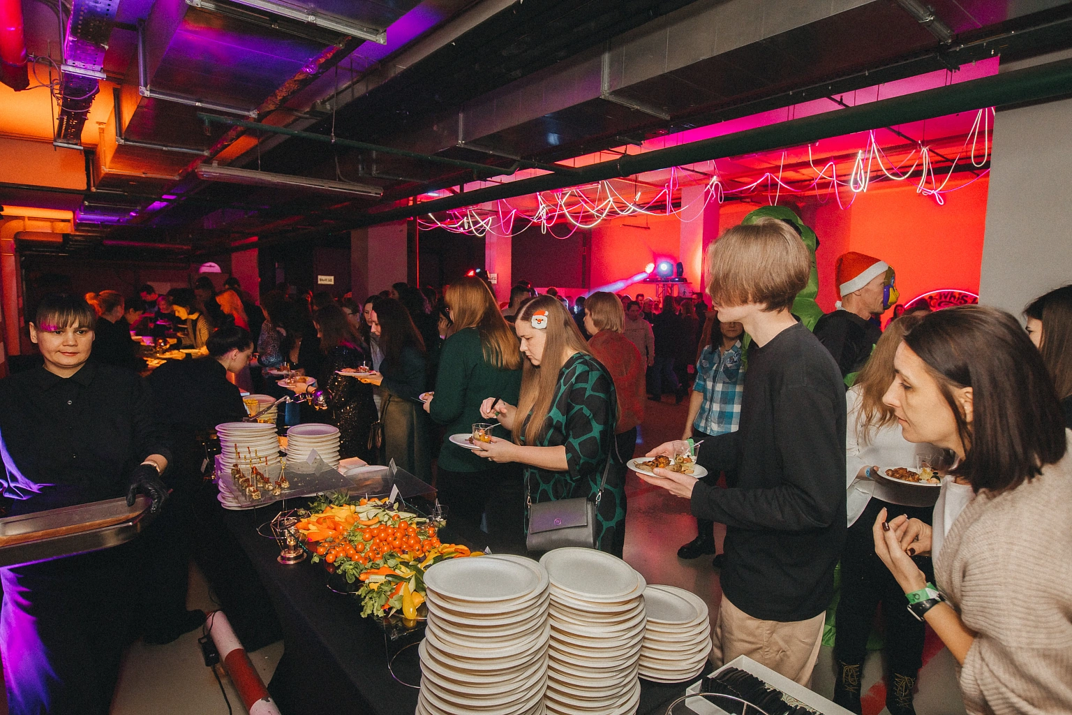 Масштабное мероприятие для гостей которого приготовили множество различных закусок холодных и горячих с красивой подачей.