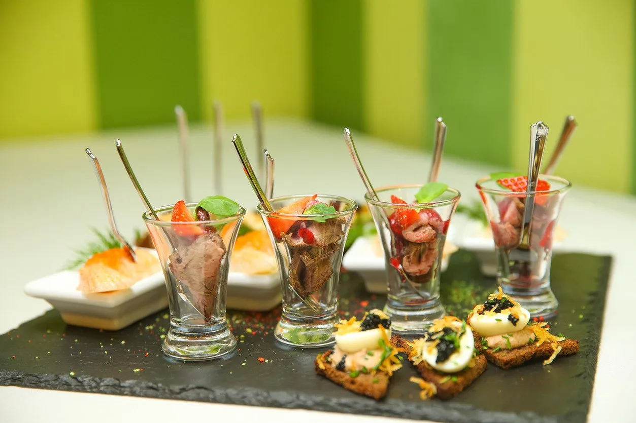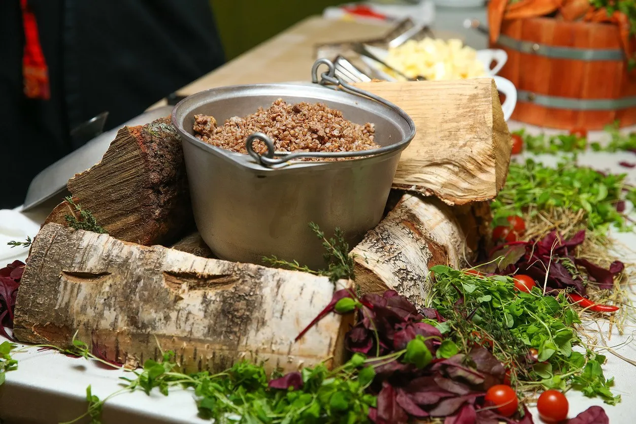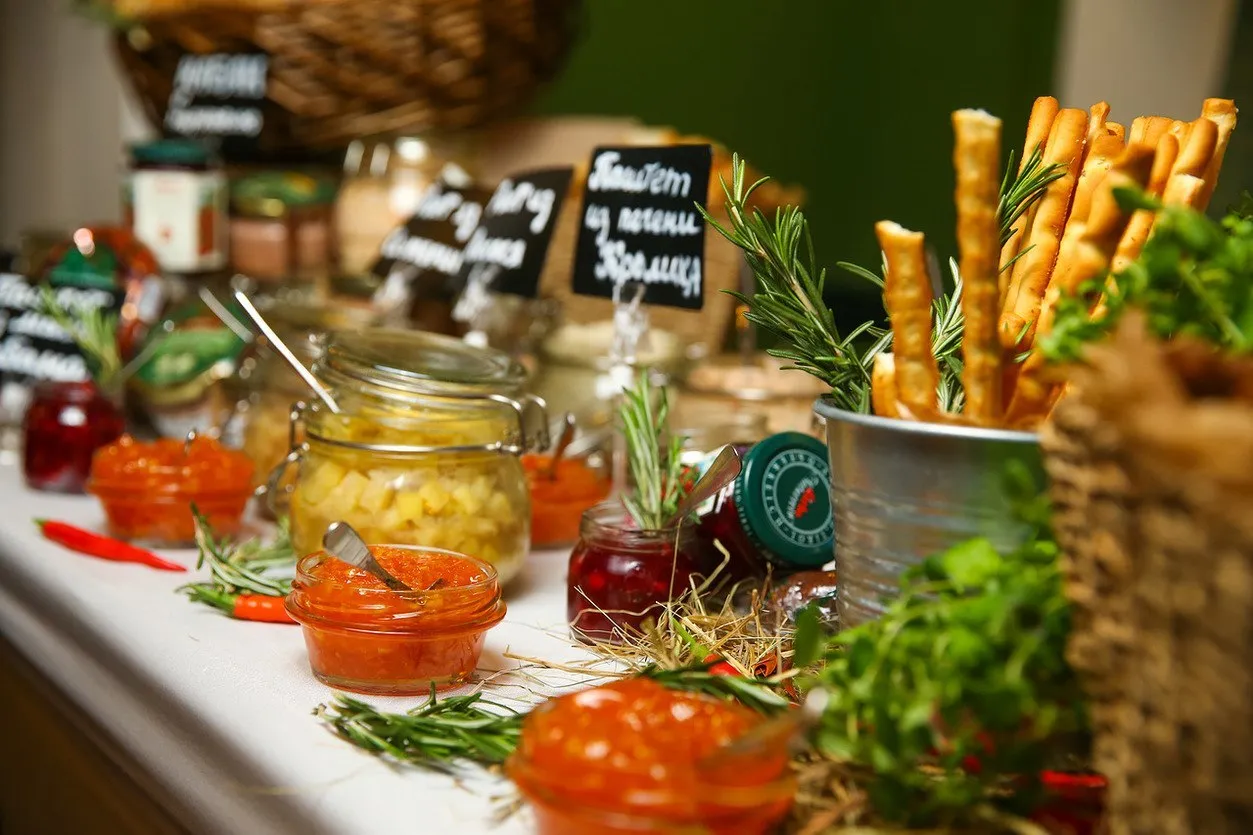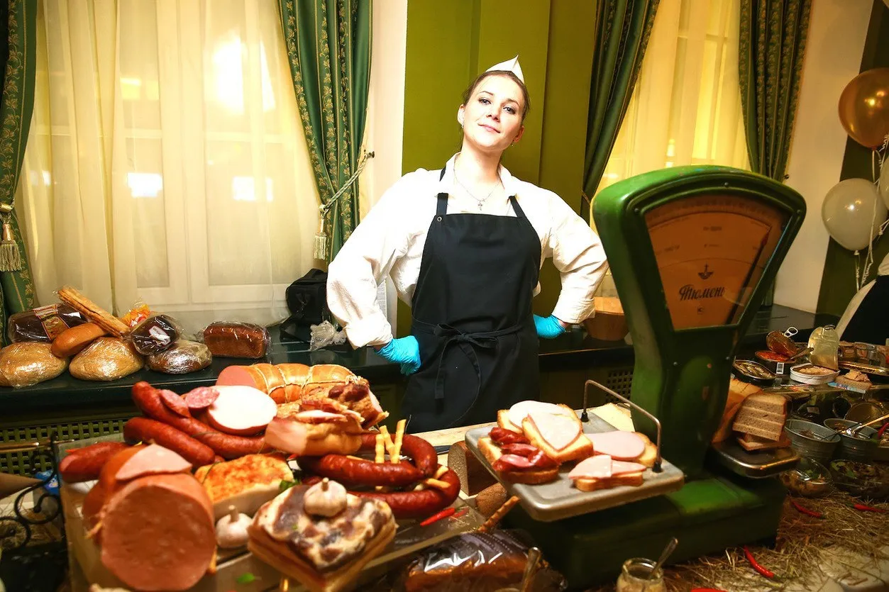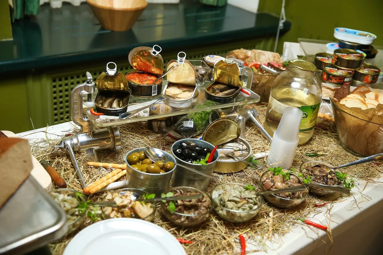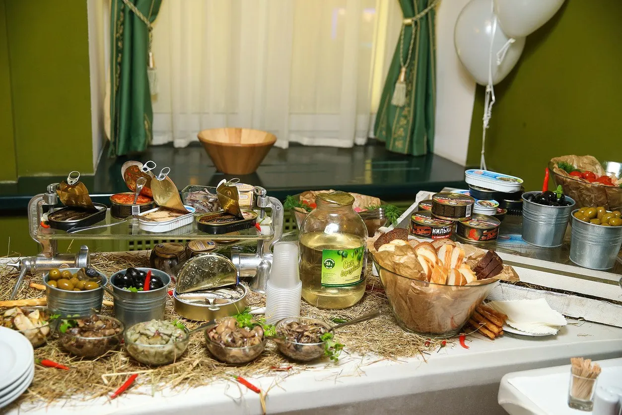 Фуршет для гостей мероприятия в стиле «30 лет назад». Мы постарались предать атмосферу продуктовых прилавков.
