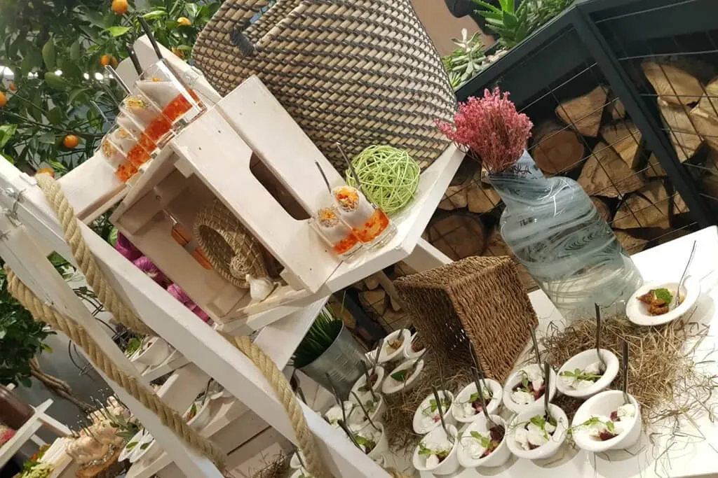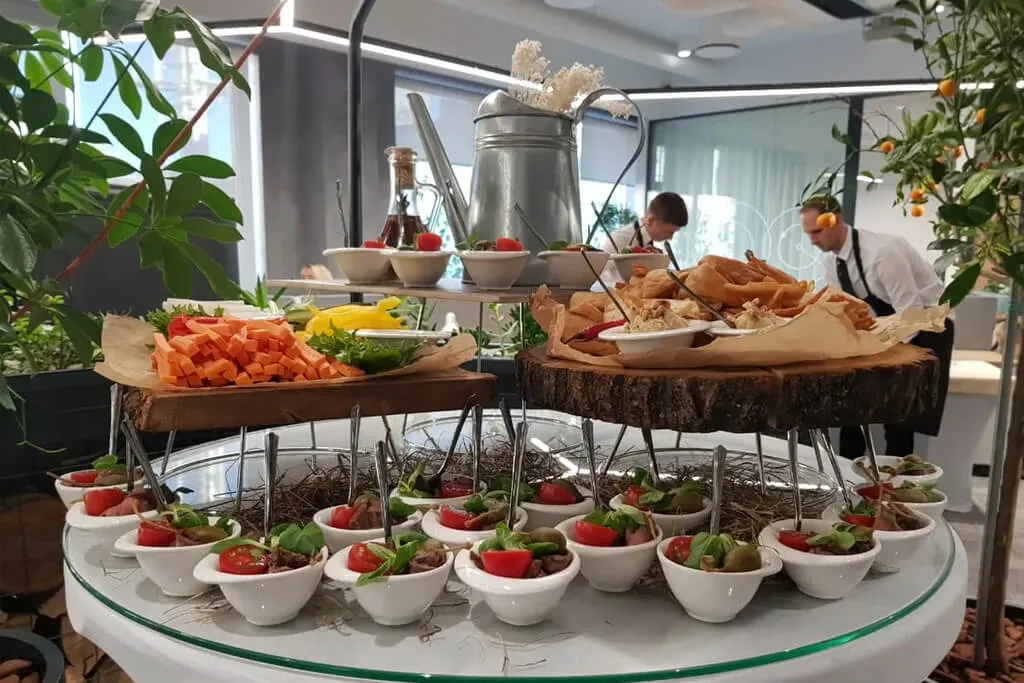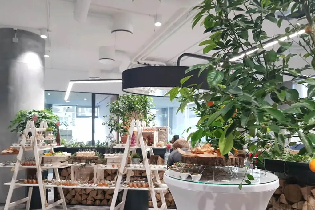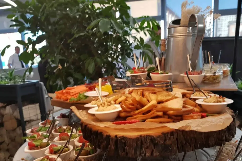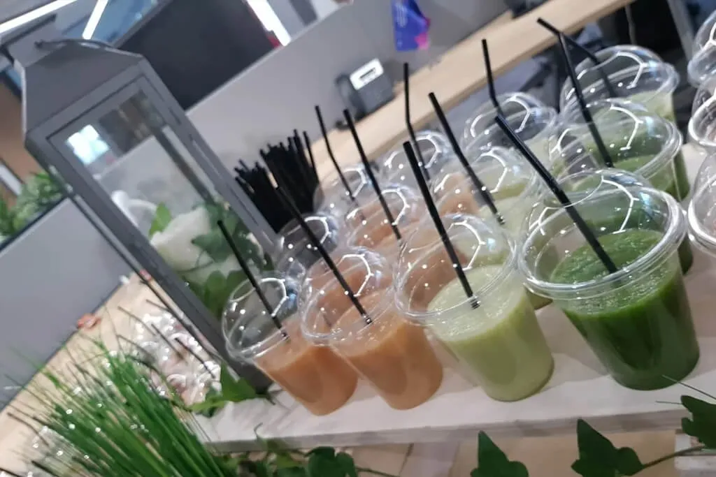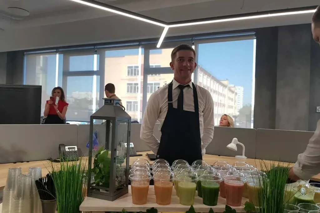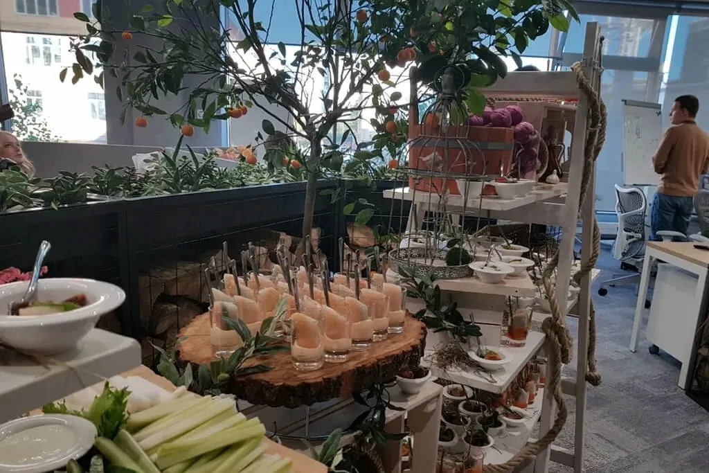 Организовать фуршет в эко стиле. Были подобраны закуски с натуральными ингредиентами, фреш и смузи бар.