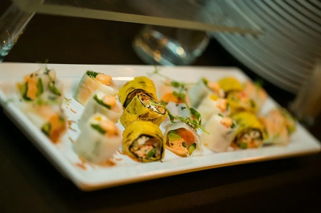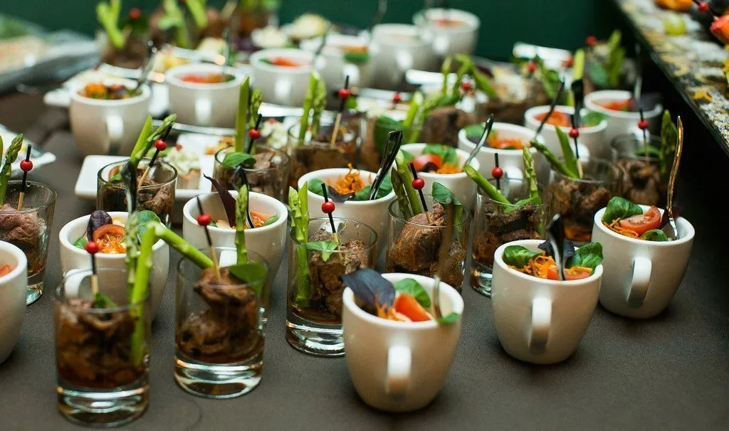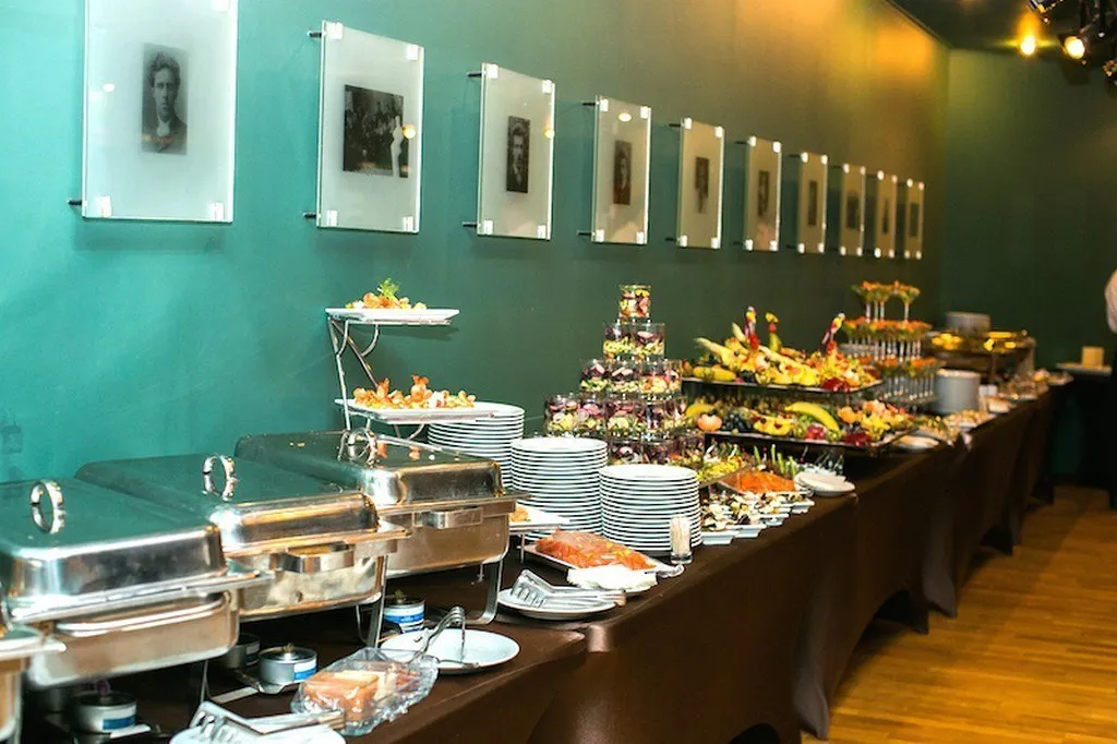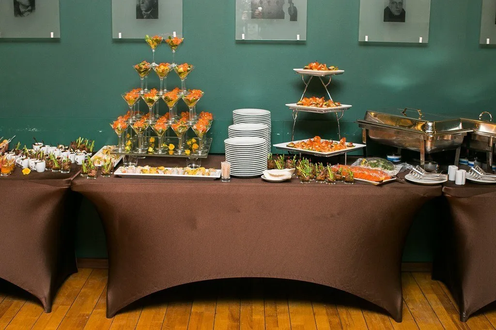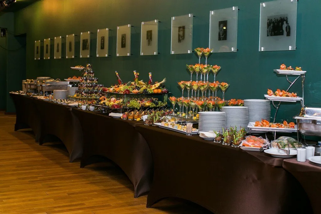 Фуршетное мероприятие в фойе театрального комплекса имени Мейерхольда. Гостей ждали холодные и горячие закуски.