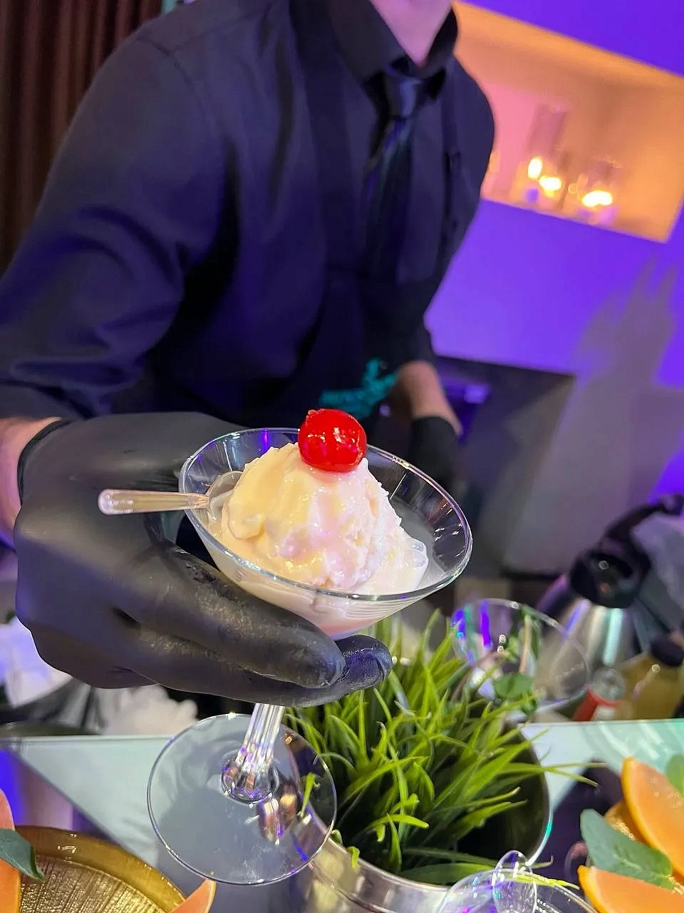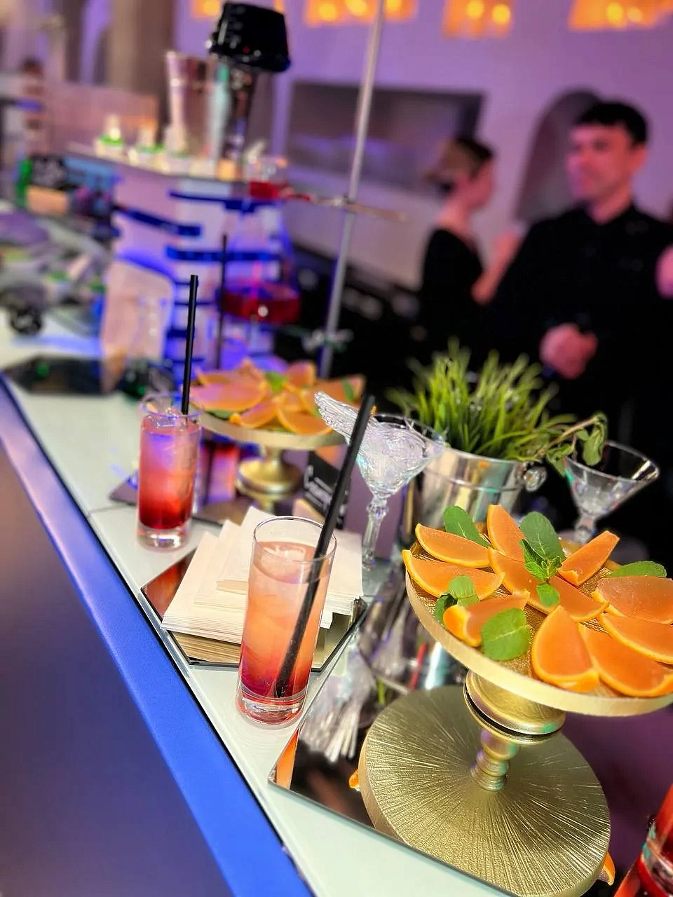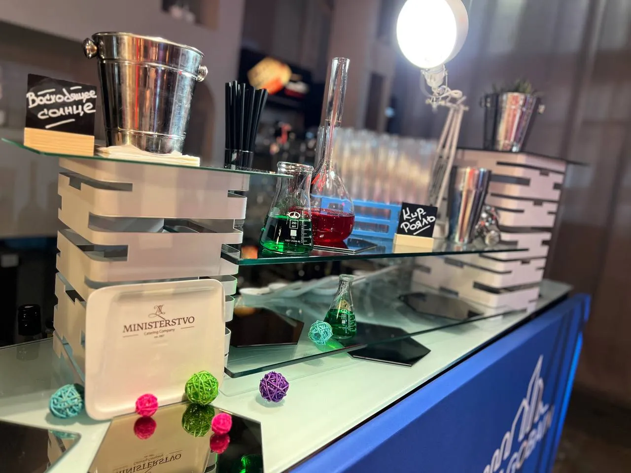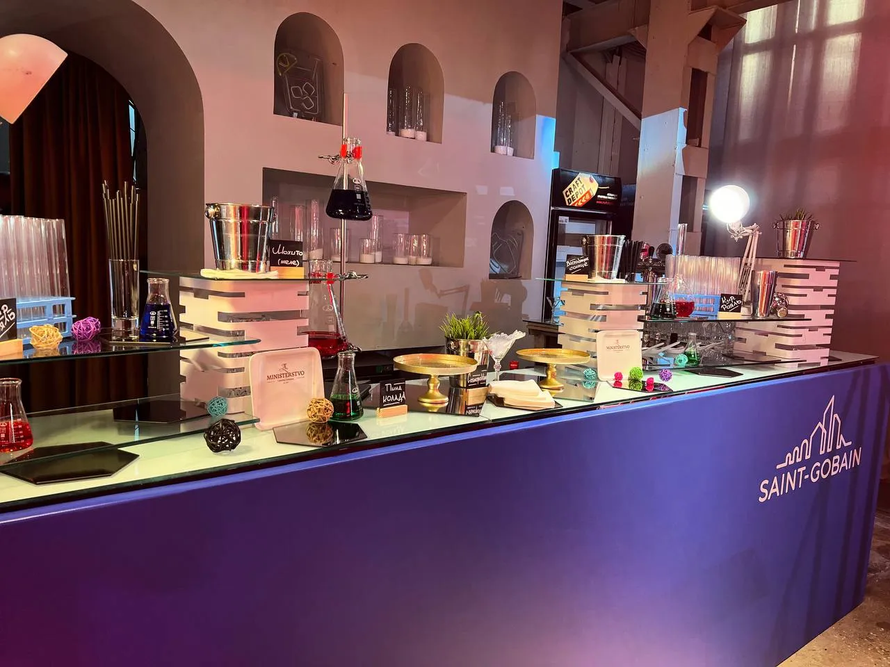 Организованный креативным агентством праздник для компании Saint Gobain (строительные материалы). Молекулярный бар в качестве комплимента гостям во время вечерней неформальной части.