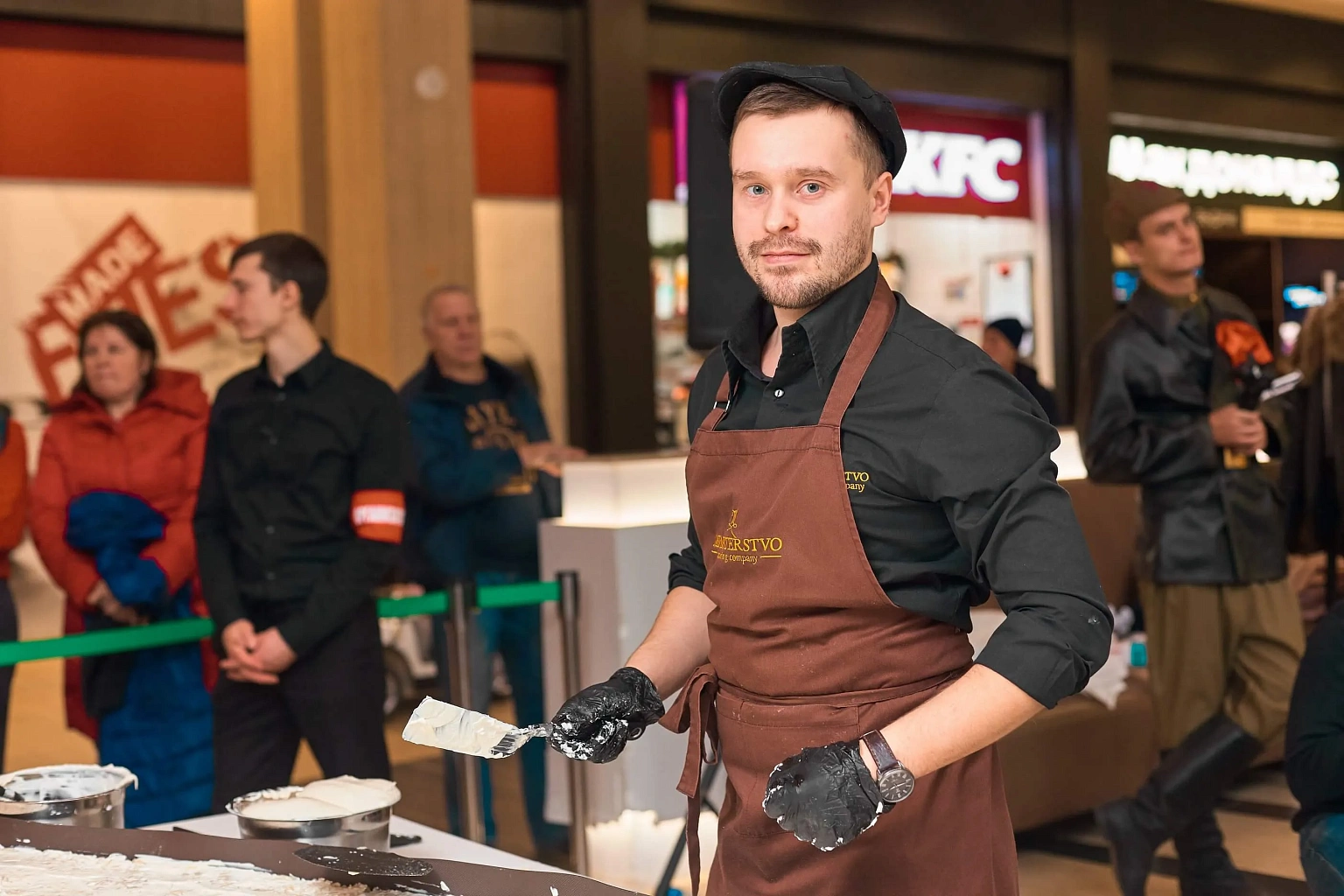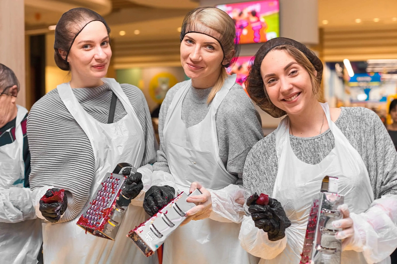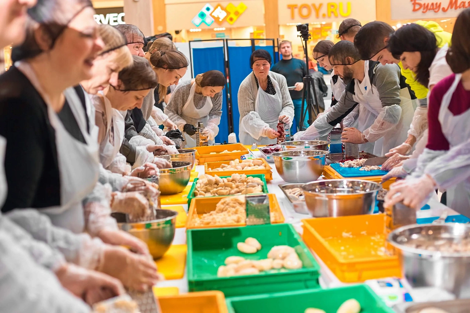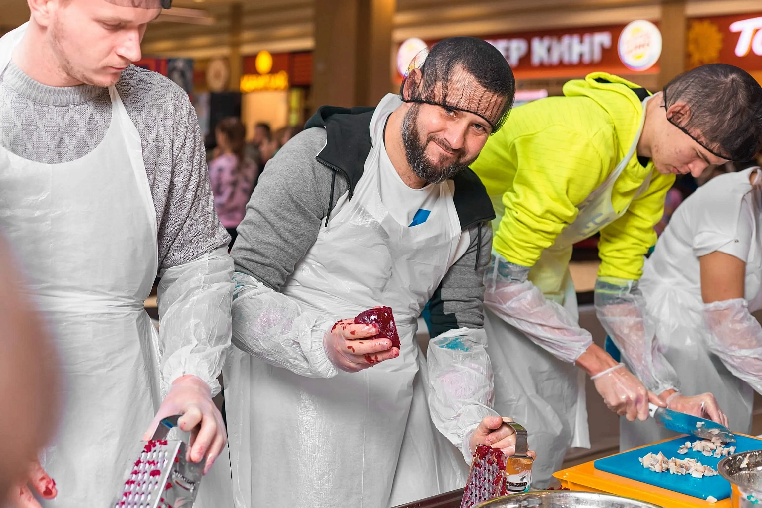 Рекордное приготовление 350 кг «Сельди под шубой» с помощью помощников из числа посетителей Торгового центра.