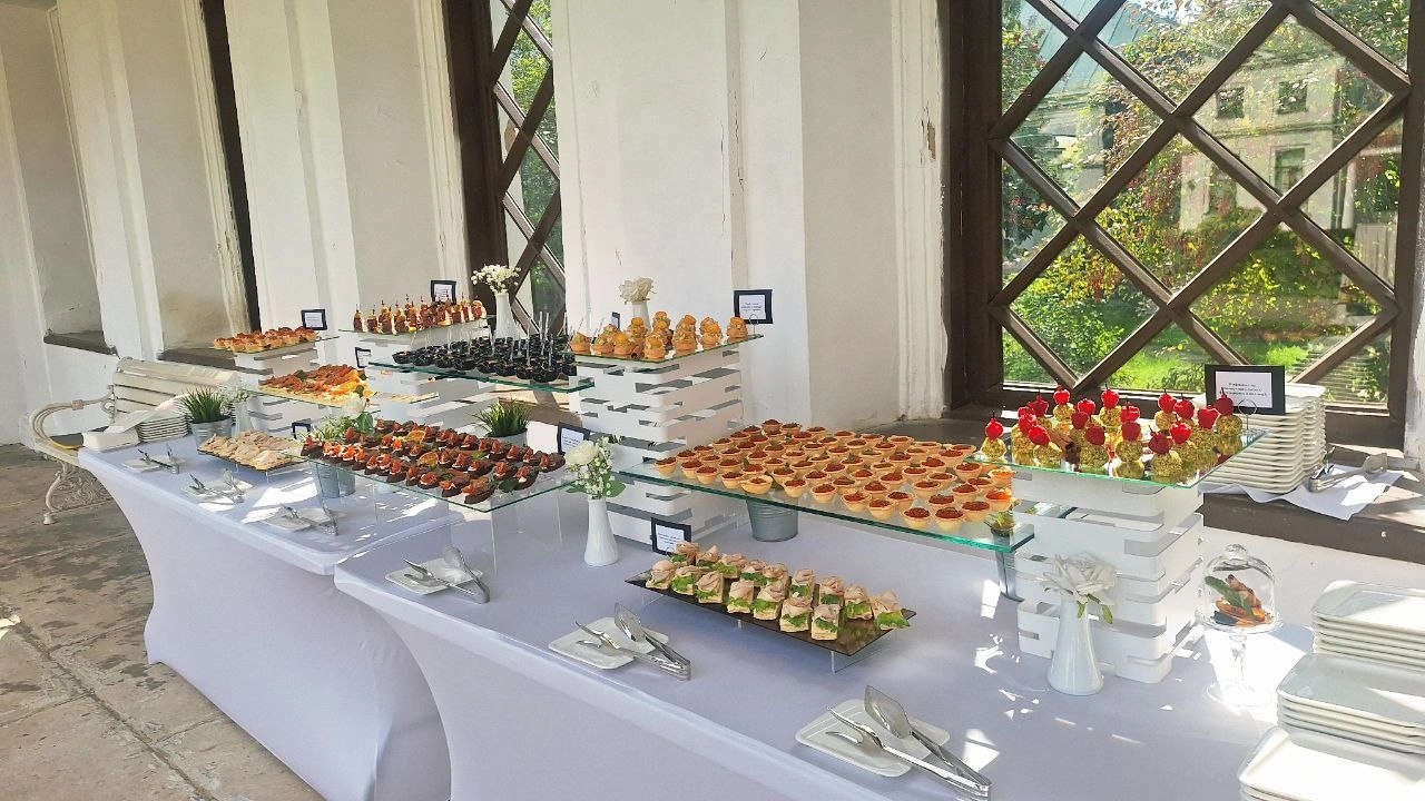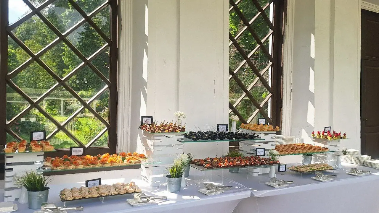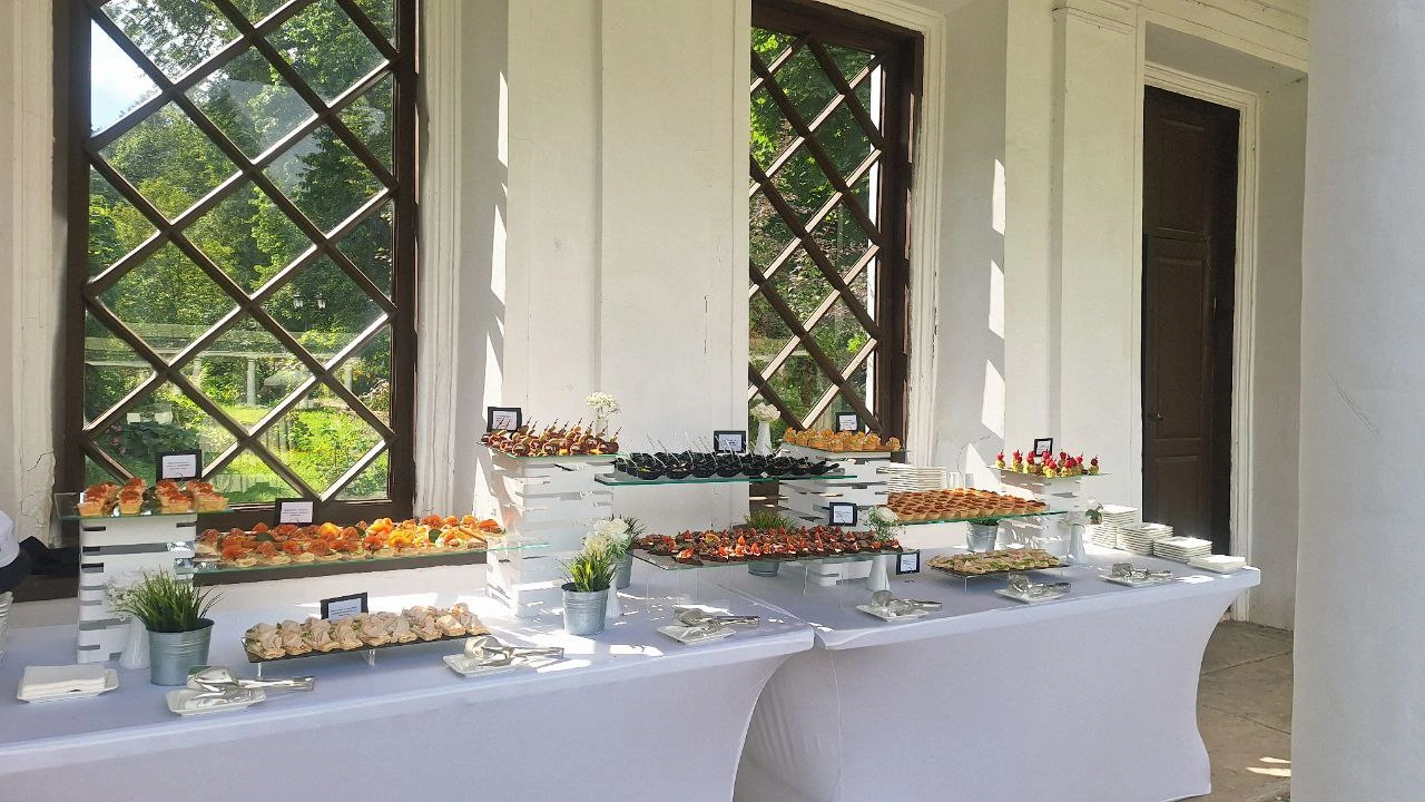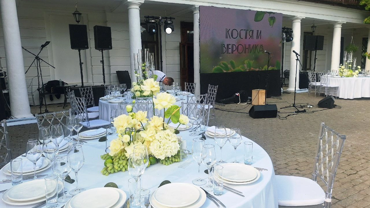 Роскошный свадебный банкет с welcome зоной и коктейль баром для Константина и Вероники! Праздник проходил для 70 гостей на главной открытой площадке усадьбы Середниково. Утонченный президиум для молодоженов был центром внимания, а блюда и напитки от нашего кейтеринга навсегда остались в сердцах гостей.