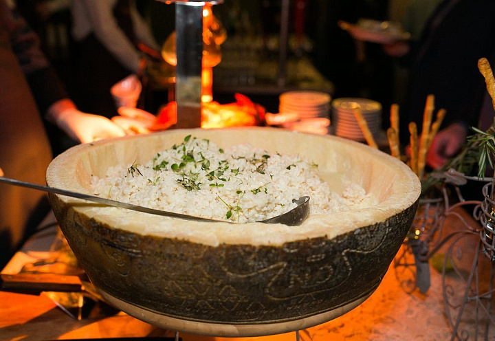 Станция с ризотто с белыми грибами, сыром пармезан и трюфельным маслом