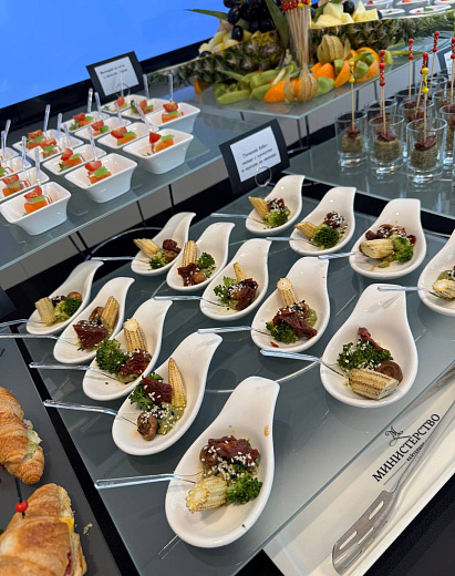 Фуршетный формат особенно удобен для офисных мероприятий: он не требует много места, не отвлекает от деловой программы и позволяет каждому гостю свободно подходить к столу и выбирать блюда по вкусу. Интерактивные элементы — карвинг-станции с бургерной или вок-меню, выездной бар с напитками — усиливают эффект и делают праздник более динамичным и запоминающимся.