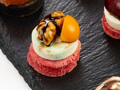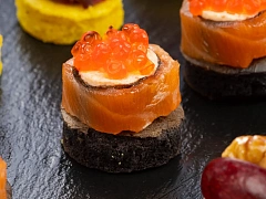 Маленькие бутерброды на шпажке — одна из самых популярных праздничных закусок. В нашем каталоге вы найдете огромное количество вариантов канапе — от традиционных до вегетарианских и экзотических. На Новый год мы бы порекомендовали канапе с ананасом фламбе и индейкой, закуски с имбирем и тунцом «Блюфин», канапе с орехом, сыром и черносливом, мини-бутерброды из вырезки с кокосовым мармеладом и манго, а также канапе из лосося с цитрусовым мармеладом.