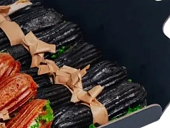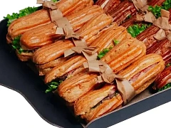 Новогодние закуски могут быть очень сытными, они даже способны заменить собой горячие блюда. Это особенно актуально, если вы запланировали небольшую вечеринку в офисе или новогодний фуршет, где горячие блюда не предусмотрены, но хочется, чтобы гости были сытыми. В таком случае мы рекомендуем заказать говядину в сливочном соусе с грибами, запеченную в касалетке под слойкой. Это невероятно аппетитное мясное блюдо, которое точно никого не оставит на празднике голодным. Также вы можете подать гостям праздничный киш — мини-пирог с потрясающей лососевой начинкой.