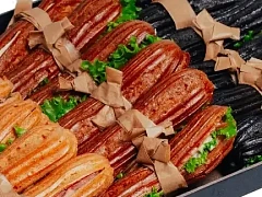 Различные рулеты и роллы внесут разнообразие в ваше праздничное меню. Обратите внимание на наше ассорти куриных рулетов с сыром фета, шпинатом, грибами, сыром, курагой и грецким орехом — очень вкусное и сытное блюдо. Гости будут в восторге от рулетиков из ветчины с сырной и шпинатной начинкой. Каждый рулетик перевязан зеленым стручком, словно новогодний подарок.