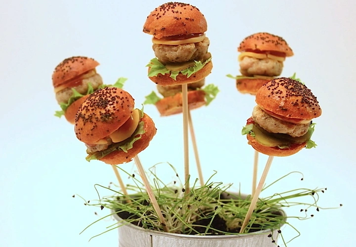 Настоящая бургерная на вашем мероприятии. Демонстрационное приготовление сочных мини-бургеров с котлетками из мяса, птицы или рыбы на разноцветных булочках с различными овощами и авторским соусом.