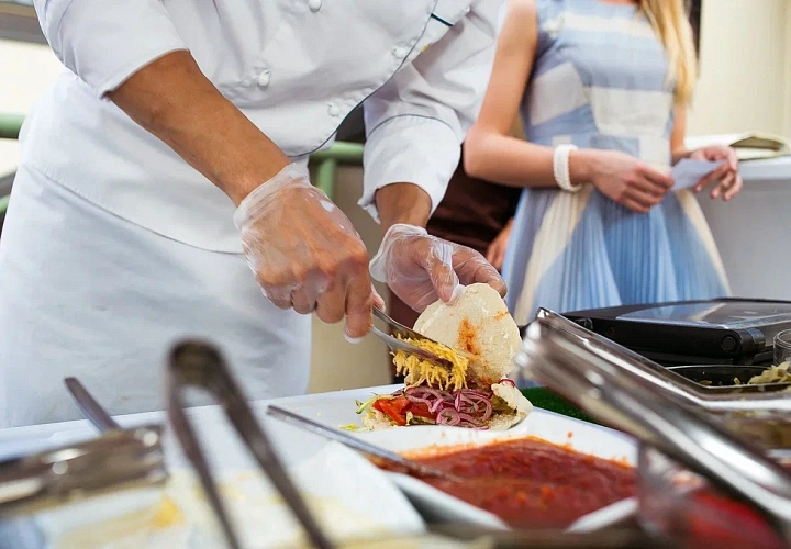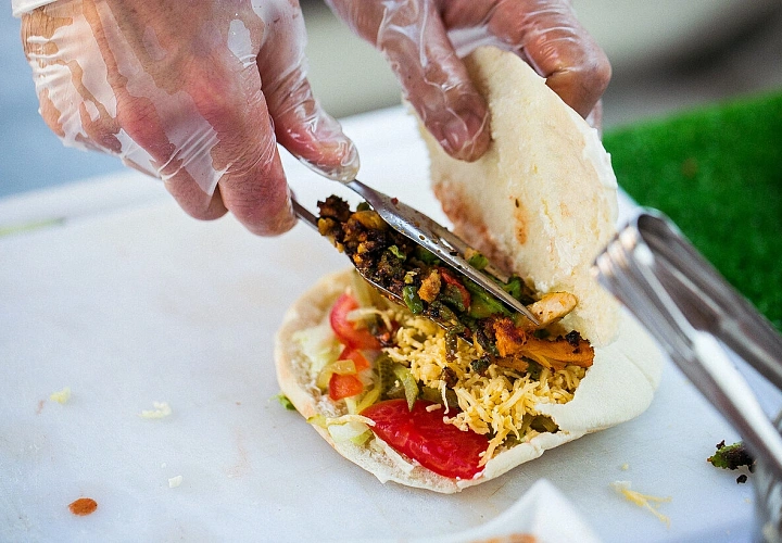 Авторская станция «Шаурма WOK» — адаптированный формат анимации для площадок с любыми техническими условиями. Вертел не используется: мясо готовится на WOK-сковороде, что позволяет установить станцию как в помещении, так и на выездных мероприятиях. Повар готовит шаурму из куриных бёдер, маринованных в восточных специях, и подаёт её с овощами, свежей зеленью и двумя соусами на выбор — томатным пикантным и Провансаль с чесноком. Гости выбирают лепёшку: белую или чёрную.