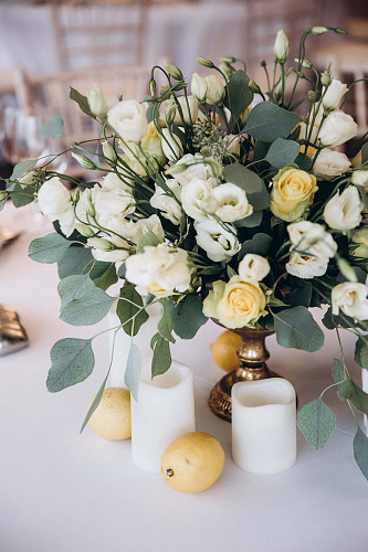 Оформление свадьбы в каком-либо цвете сейчас пользуется огромной популярностью. Пожалуй, самый жизнерадостный вариант – свадьба в желтом цвете. Цвет солнца, тепла и нового дня станет оригинальным акцентом вашего праздника и символом жаркой любви. Желтая свадьба может быть оформлена при помощи сочных цитрусовых. Лимоны, апельсины или лаймы наполнят свадебную площадку яркостью, изображение цитрусовых украсит салфетки и свадебное меню. Также будут уместны желтые лилии, тюльпаны, подсолнухи и трогательные ромашки. В декоре желтый хорошо сочетается с белым и природной зеленью.