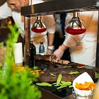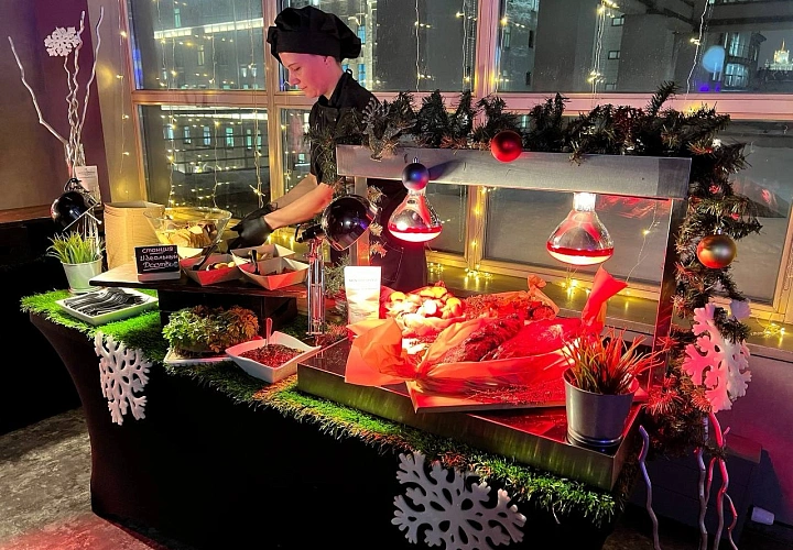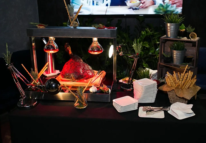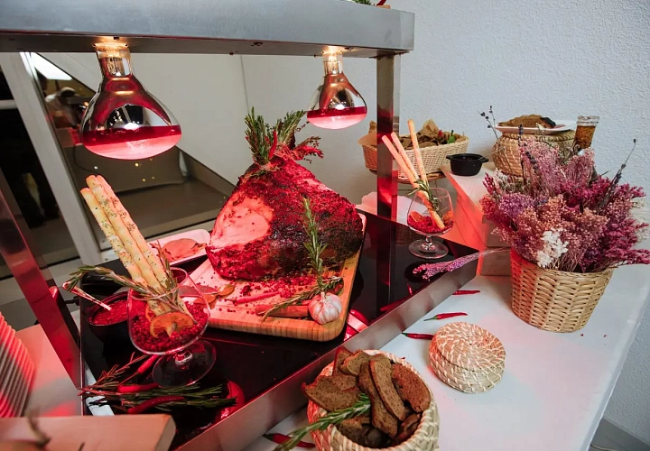 Авторская станция “Идеальный ростбиф”. Демонстрационное слайсирование сочного ростбифа, греющегося под лампой. Повар предложит гостям тонкие кусочки запеченного пряного ростбифа. Подается в сервировке с микс салатом и соусом.