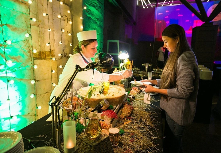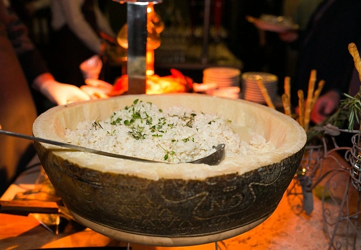 Авторская станция “Ризотто с белыми грибами”. Повар при гостях приготовит настоящее ризотто с белыми грибами и трюфельным маслом и засервирует его в половинке сыра "Пармезан"