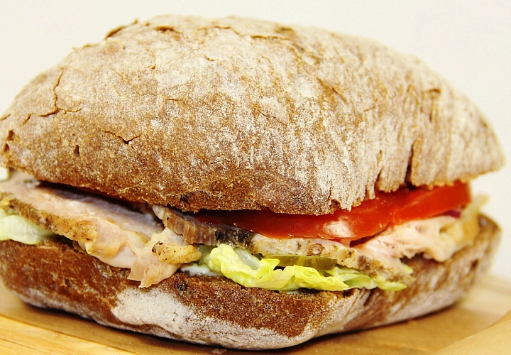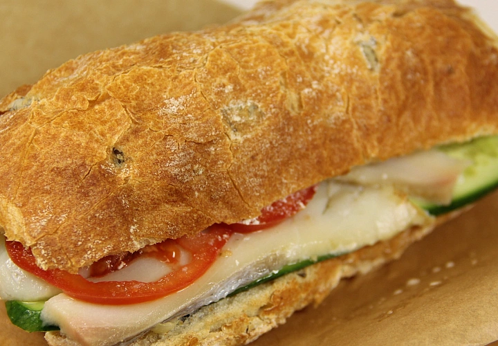 - Из наполнителей: свиной окорок, ветчина, филе индейки, лосось слабой соли, сыр чеддер, сыр моцарелла, томаты, огурец свежий, огурец маринованный, лук красный, салат айсберг, руккола и картофельные дранники
