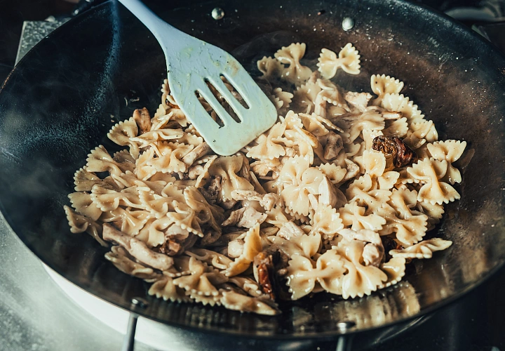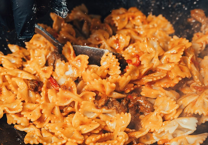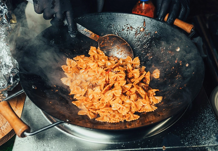 Повар при гостях приготовит пасту в «Сковороде кочевника» и дополнит ее ингредиентами на выбор (креветки, куриное филе, говядина, бекон, ветчина, шпинат, шампиньоны, помидоры черри, соус сливочный, соус томатный) — насыщенный формат с гибкой подачей для мероприятий разного уровня.